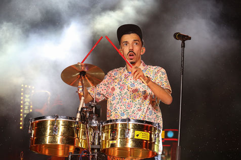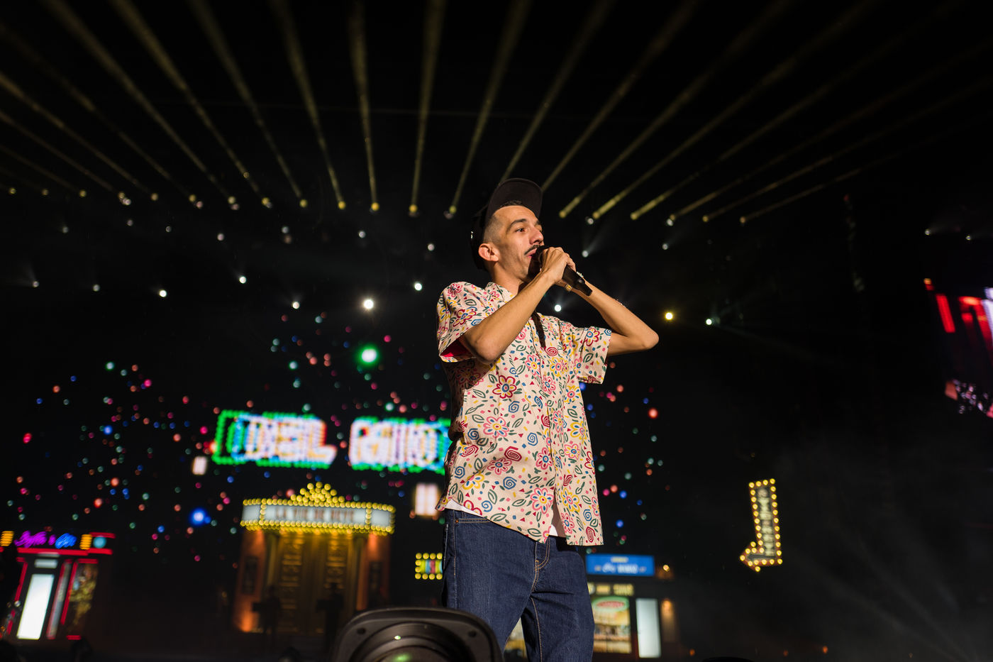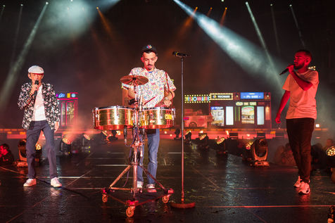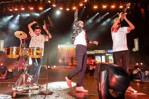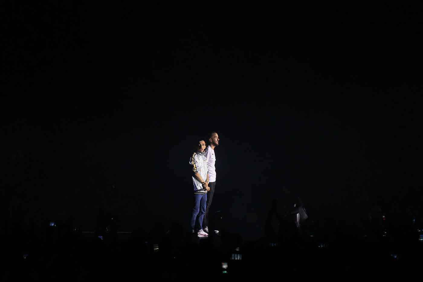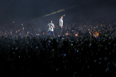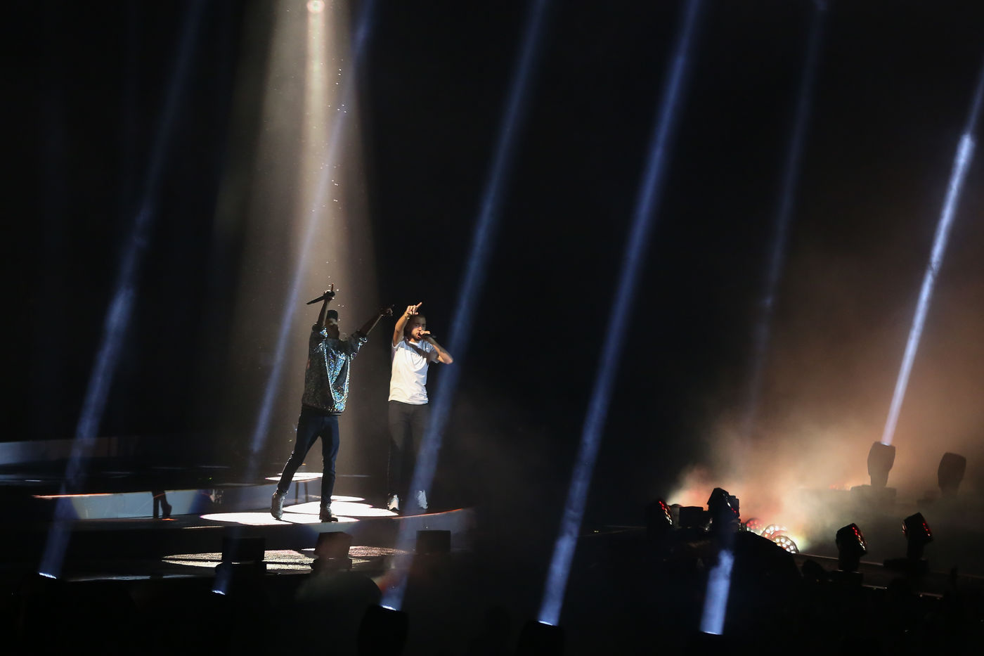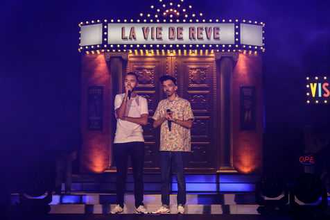 The two rappers Bigflo & Oli during their show at the Stadium de Toulouse which they decided to fill on May 24 and 25. Bigflo et Oli, sometimes abbreviated B&O, is a French rap group from Toulouse. It is composed of Florian Bigflo and Olivio Oli Ordonez. The duo released their first album La Cour des grands in 2015, they are certified gold record less than four months after its release and platinum record in France. They are to this day the youngest French rappers to hold these awards. May 24, 2019, Toulouse, France.