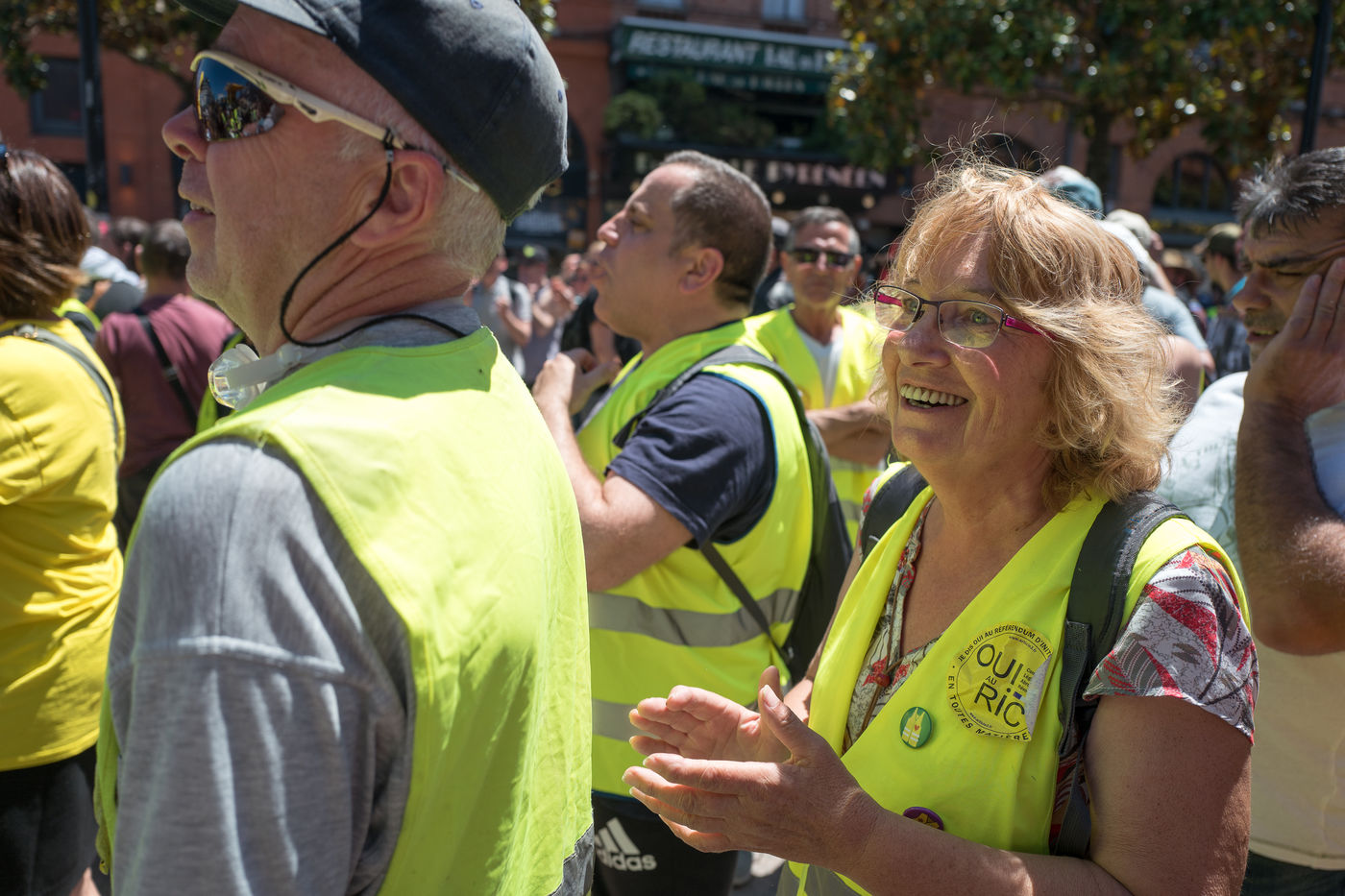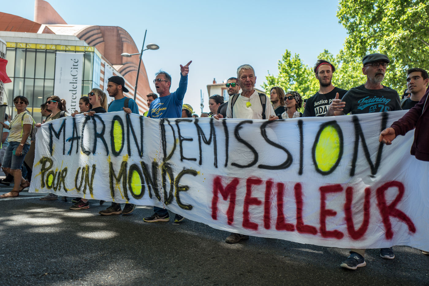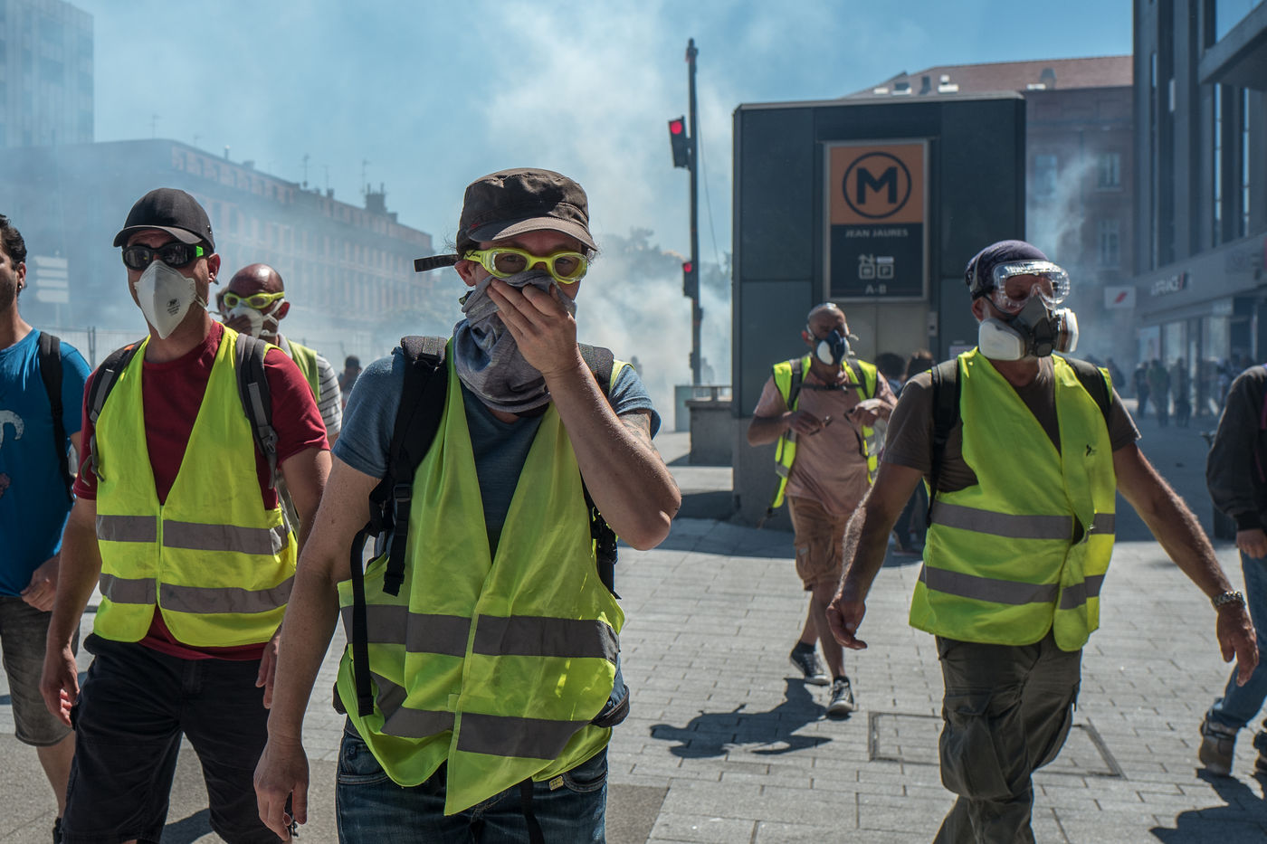 A thousand people marched through the city centre of Toulouse in the south of France during the XXIX act of the Yellow Vests movement. The movement began in France on 17 November 2018 to protest initially against the rise in fuel prices, for purchasing power, the creation of the RIC and the movement turned into a major revolt against French President Emmanuel Macron. About 1000 people demonstrated calmly before the police used tear gas to disperse the demonstration. June 1, 2019, Toulouse, France.