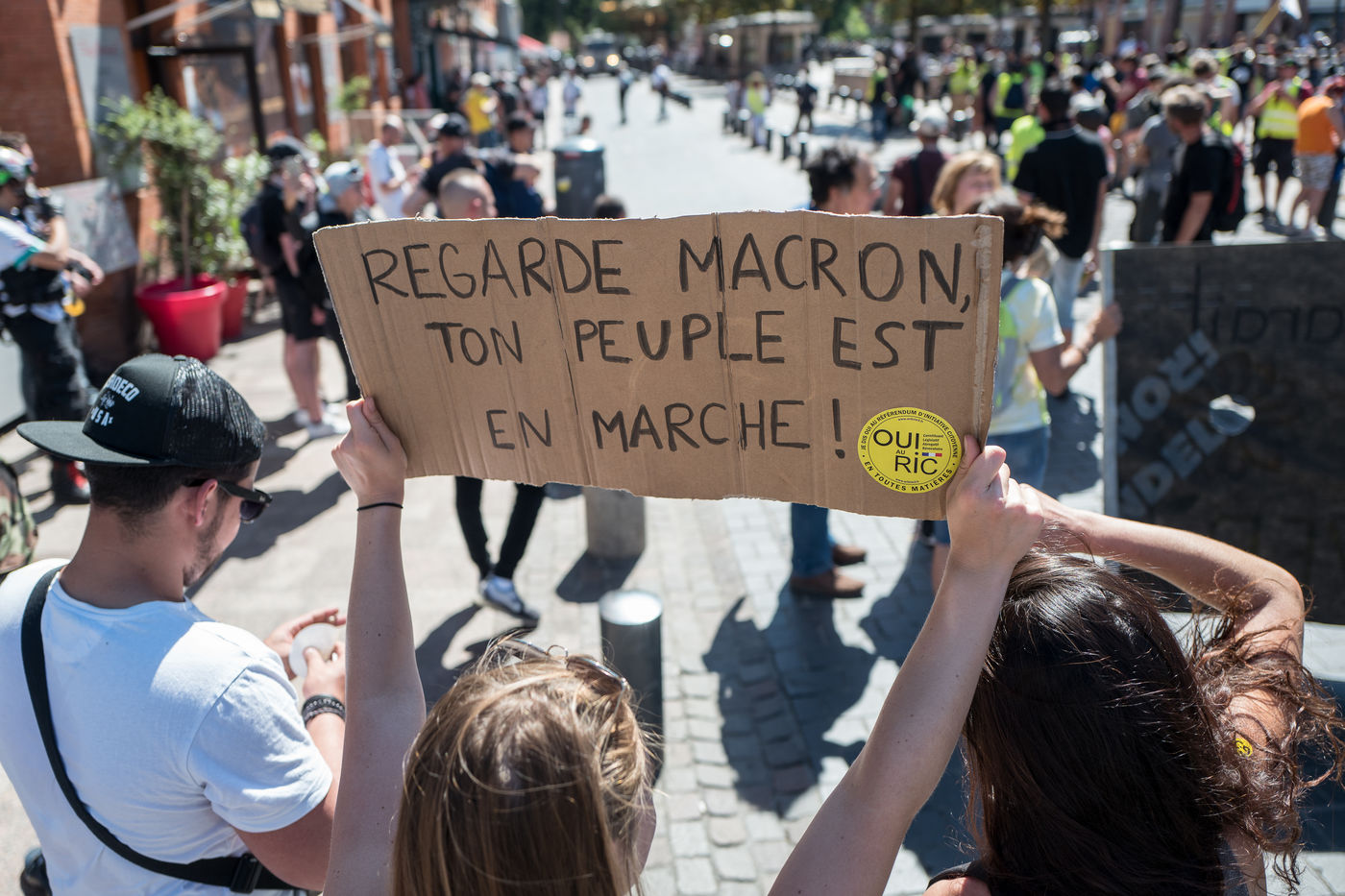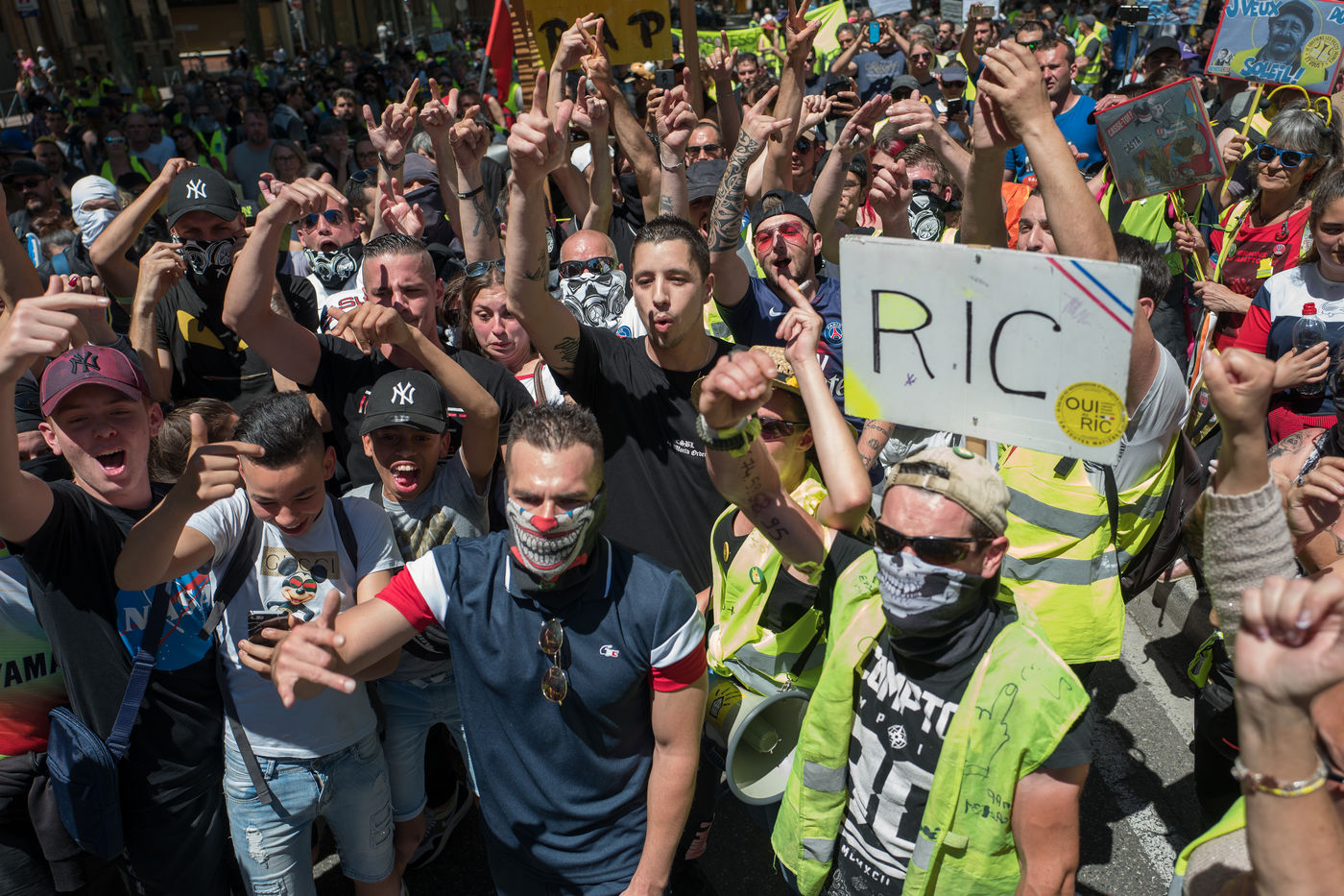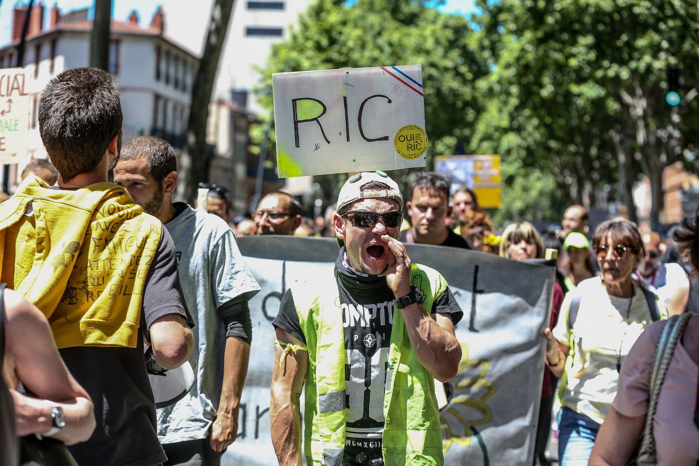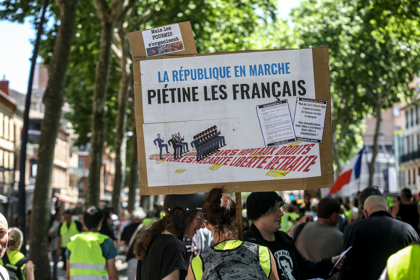 A thousand people marched through the city centre of Toulouse in the south of France during the XXIX act of the Yellow Vests movement. The movement began in France on 17 November 2018 to protest initially against the rise in fuel prices, for purchasing power, the creation of the RIC and the movement turned into a major revolt against French President Emmanuel Macron. About 1000 people demonstrated calmly before the police used tear gas to disperse the demonstration. June 1, 2019, Toulouse, France.
