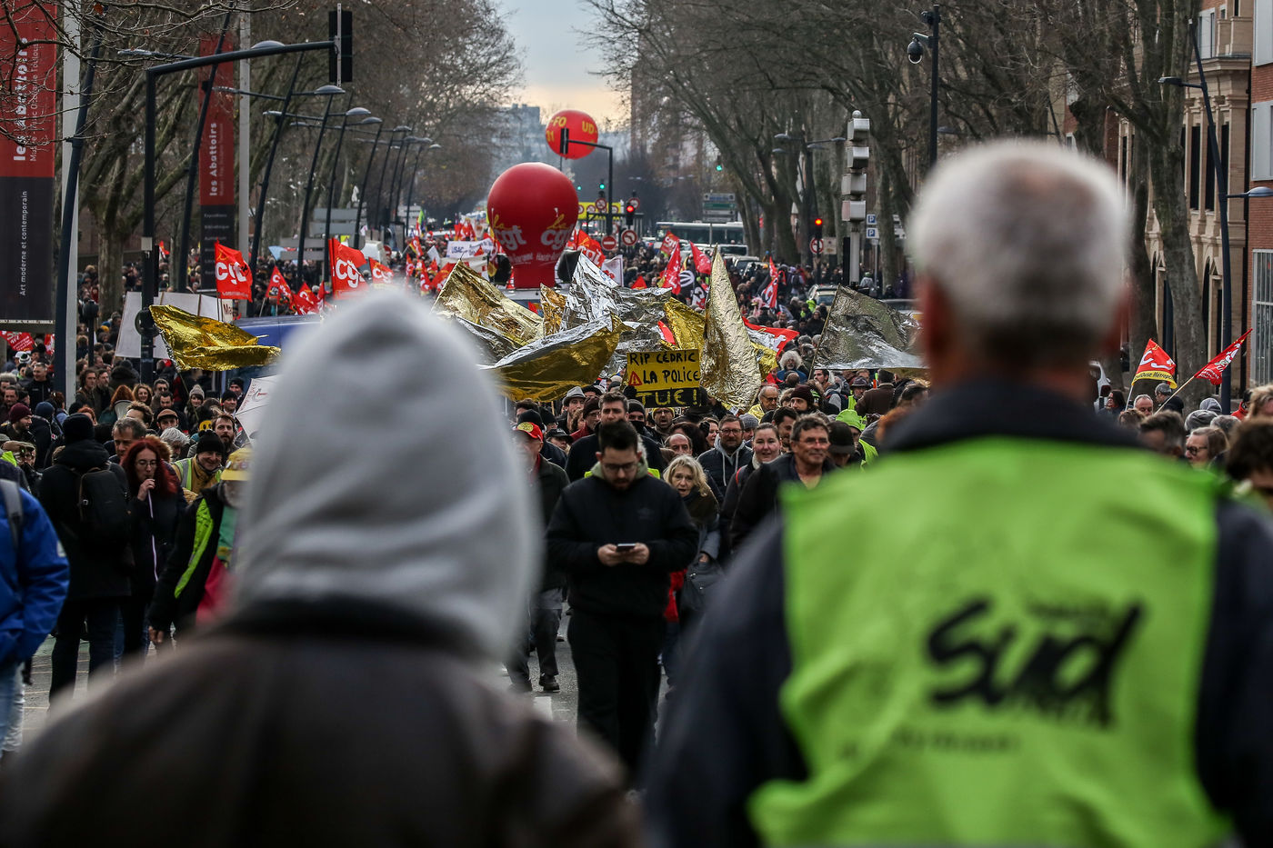 Des manifestants défilent dans le centre ville de Toulouse dans le sud de la France pour protester contre la réforme des rétraites prévue par le gouvernement d'Edouard Phillipe. A l'appel de nombreux syndicats, c'est un autre jour de mobilisation dans l'ensemble du pays.