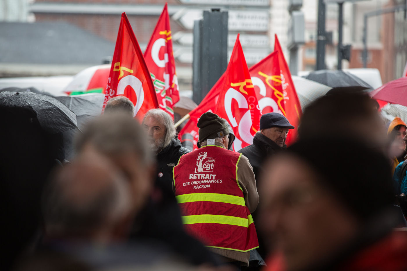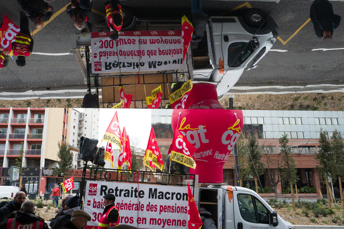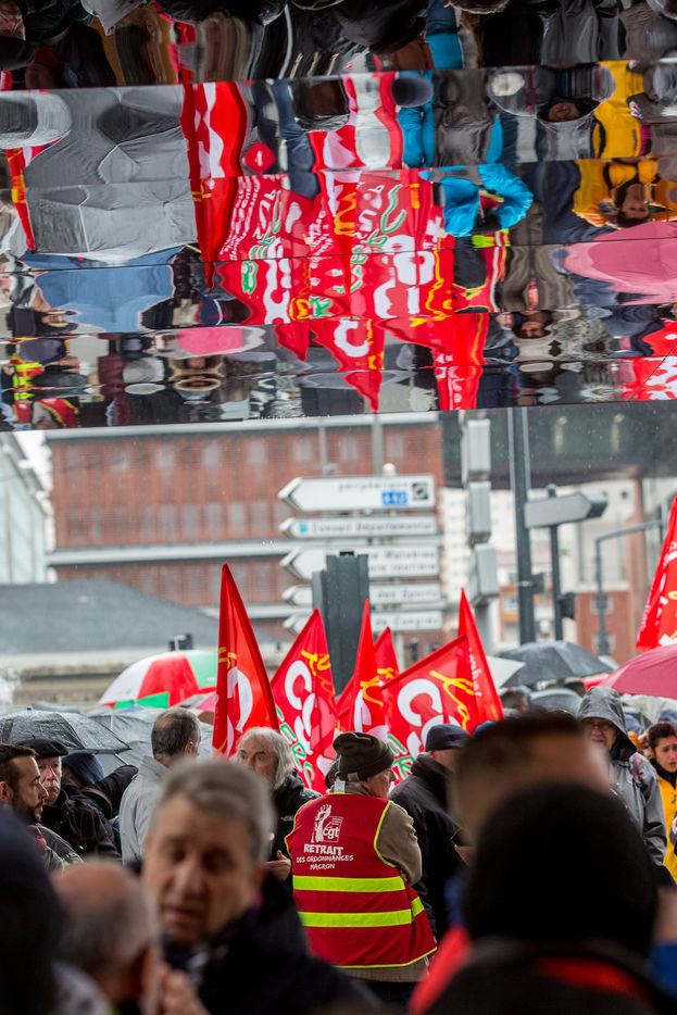 A l'appel des syndicats, dont la CGT des manifestants ont defilé dans le centre ville de Toulouse pour dénoncer l'utilisation de l'article 49.3 de la constitution utilisé par le premier ministre Edouard Philippe pour faire adopter la réforme des retraites. 3 mars 2020 , Toulouse, France.