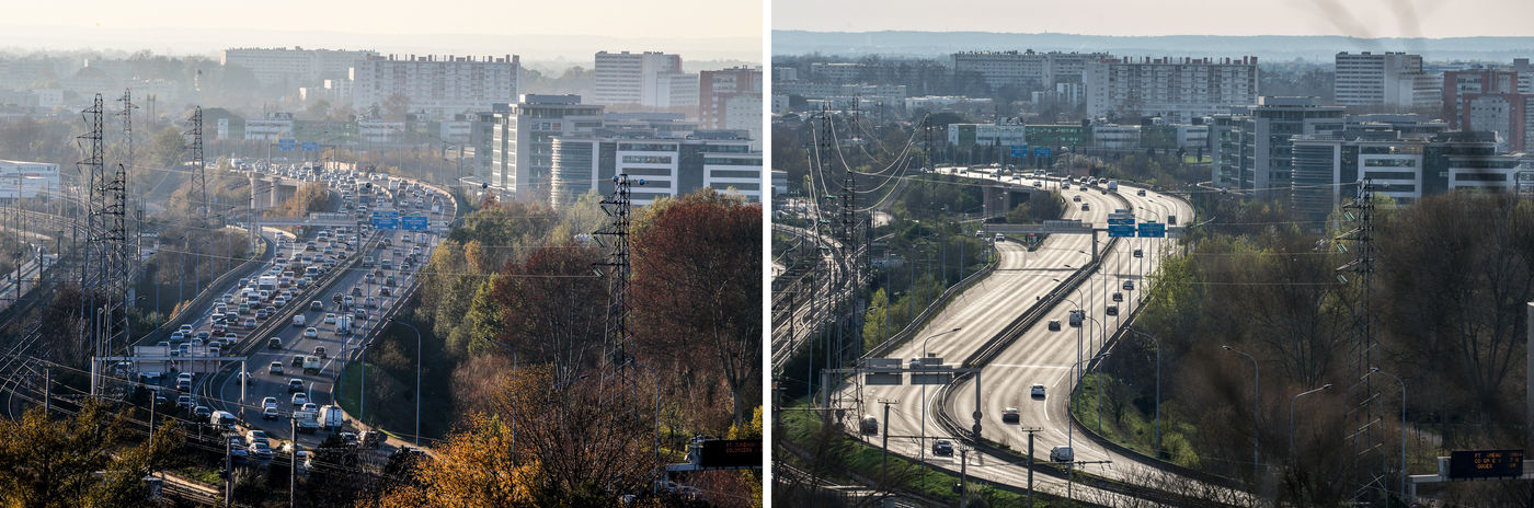 Assemblage de deux images en dyptique pour illustrer le confinement lié à la crise du Coronavirus alors que la France est passée en confinement le 17 mars à midi pour contenir l'épidémie sur le territoire.