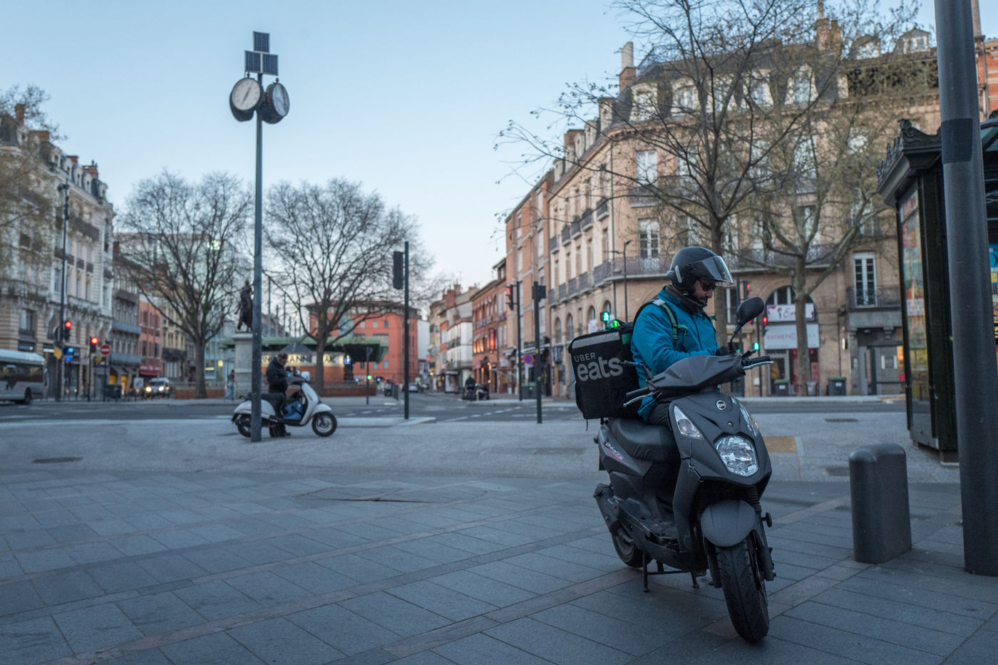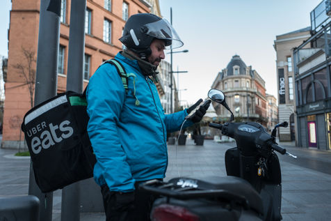 Malgré la crise qui touche le pays avec la crise du coronavirus et la mise en place du confinement depuis le 17 mars 2020, les plateformes de livraison de repas sont autorisées à poursuivre leurs activités. Sebaa, 42 ans continue sur son scooter de livrer pour Uber Eats des repas à domicile dans le centre ville de Toulouse.