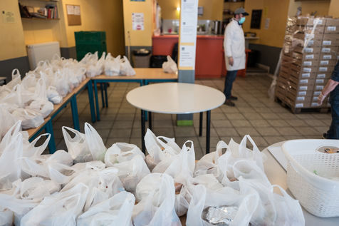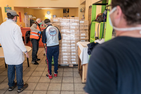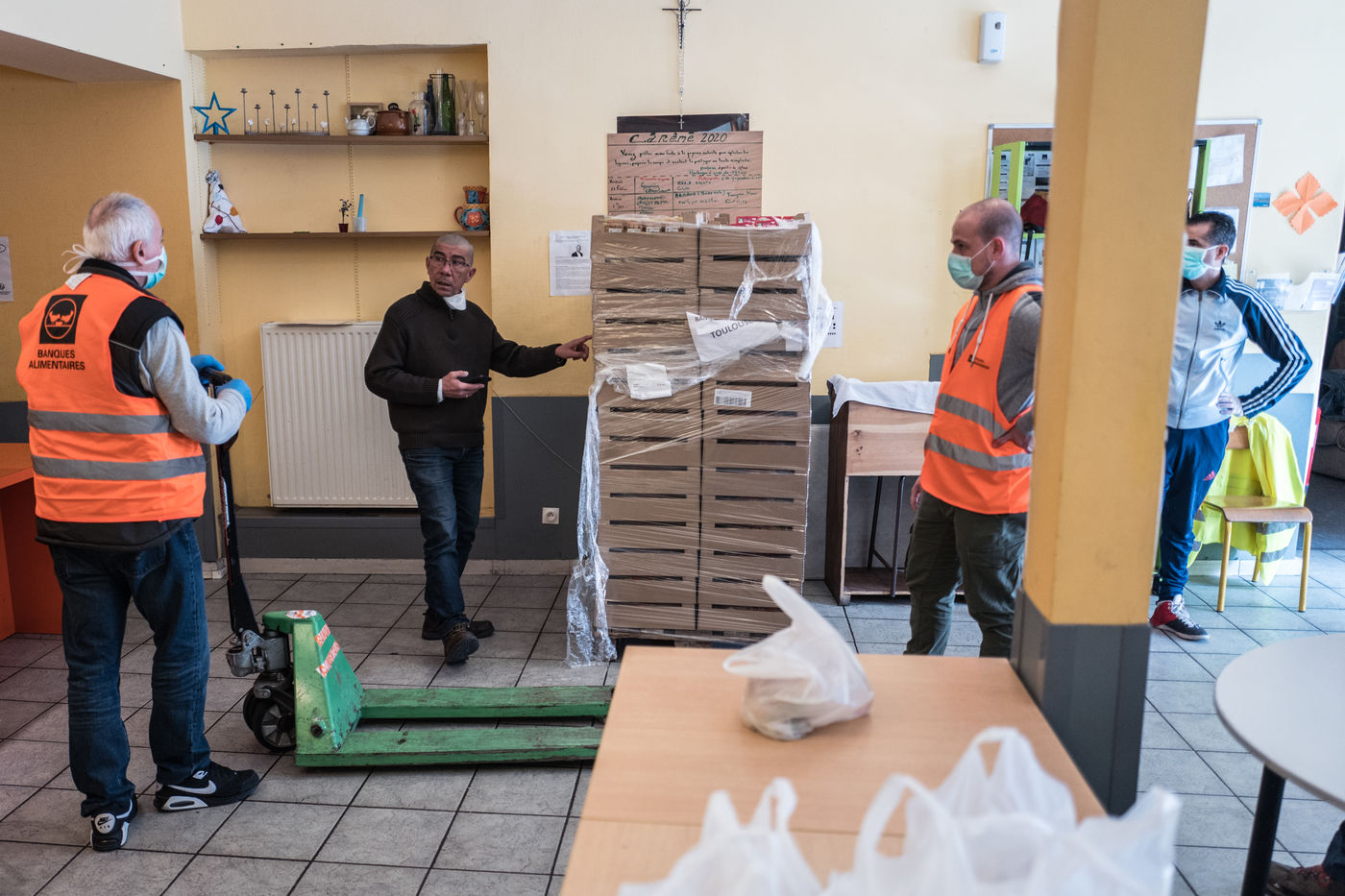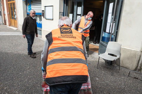 Au local de l'Ostalada des bénévoles du Secours Catholique recoivent les dons de la banque alimentaire et préparent des repas qui seront distribués aux personnes les plus démunis, notamment les Sans Domicile Fixe alors que la France est passée en confinement le 17 mars pour contenir l'épidemie liée au Coronavirus.