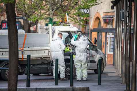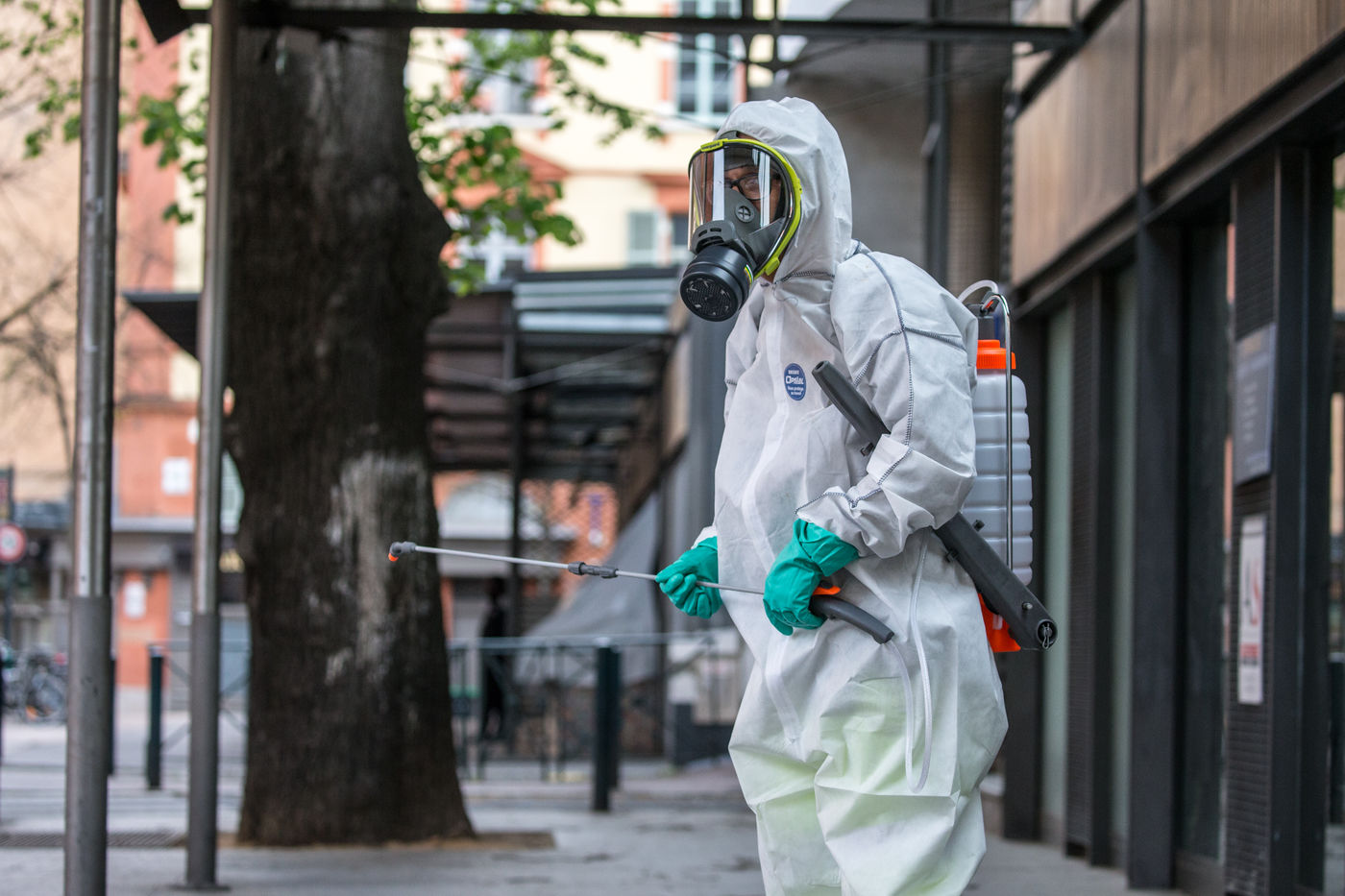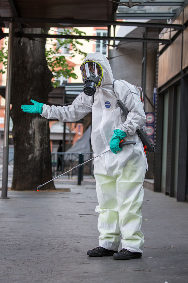 Depuis le 6 avril la ville de Toulouse a mis en place la désinfection du mobilier urbain a proximité de 180 sites ciblés sur tout le territoire de la commune. Les agents municipaux sont masqués et sont revêtus de combinaisons intégrales, ils pulvérisent un mélange d'eau et de javel pour nettoyer et limiter la propagation du Coronavirus, Covid-19, alors que la France est en confinement depuis le 17 mars 2020.