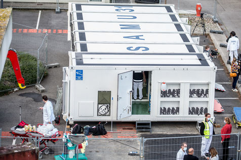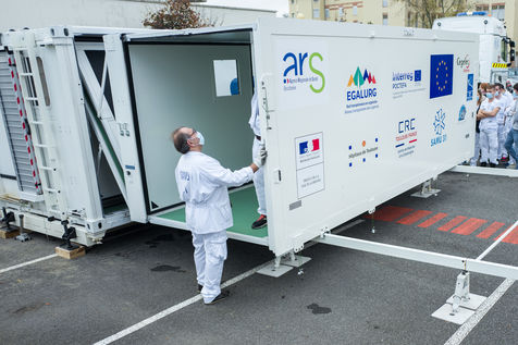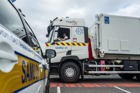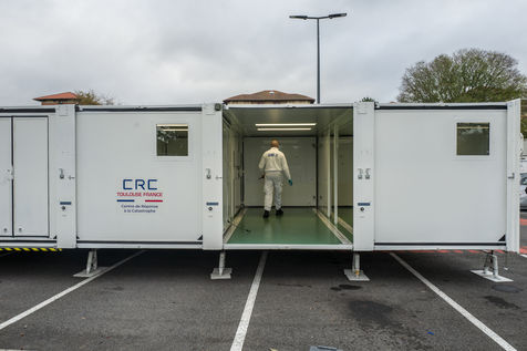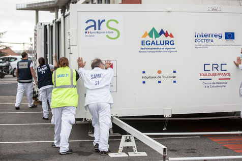 Dans le cadre de la lutte contre l'épidémie du Coronavirus, Covid-19, le CHU de Toulouse teste un camion prototype issu de la technologie militaire unique en Europe, Centre de Réponse à la Catastrophe, CRC, qui pourra en moins dune heure mettre à disposition 5 salles pour accueillir jusqu'à 18 patients en réanimation. Après plusieurs tests, le camion part pour Bayonne.