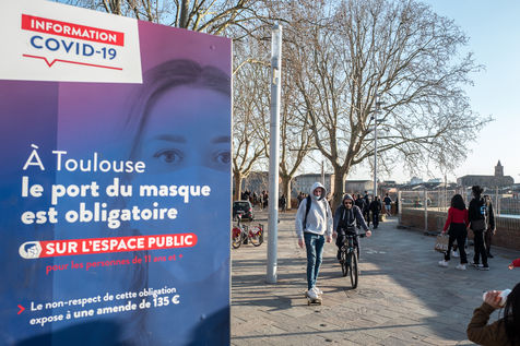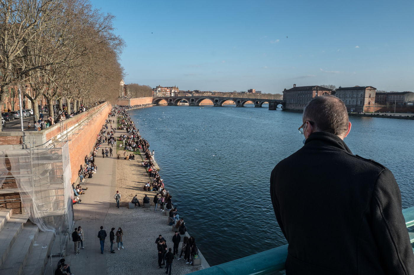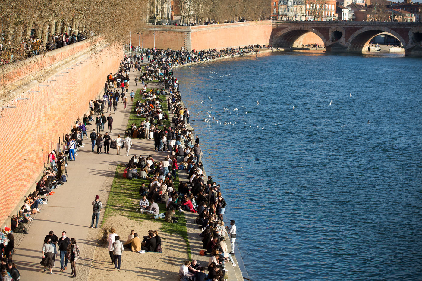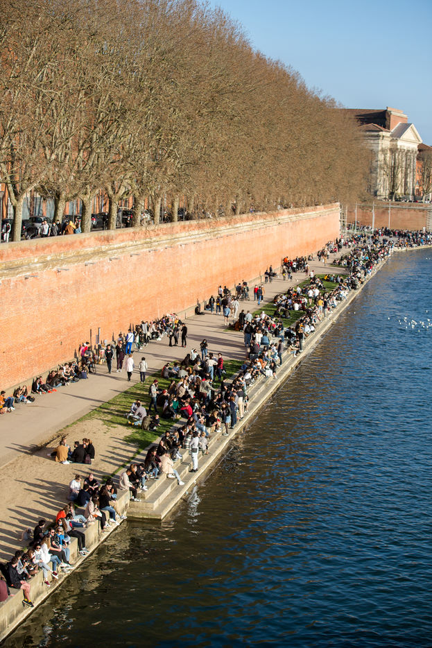 Many people came to enjoy the good weather along the banks of the Garonne during the weekend until the fixed curfew time at 6 p.m. February 28, 2021, Toulouse, France