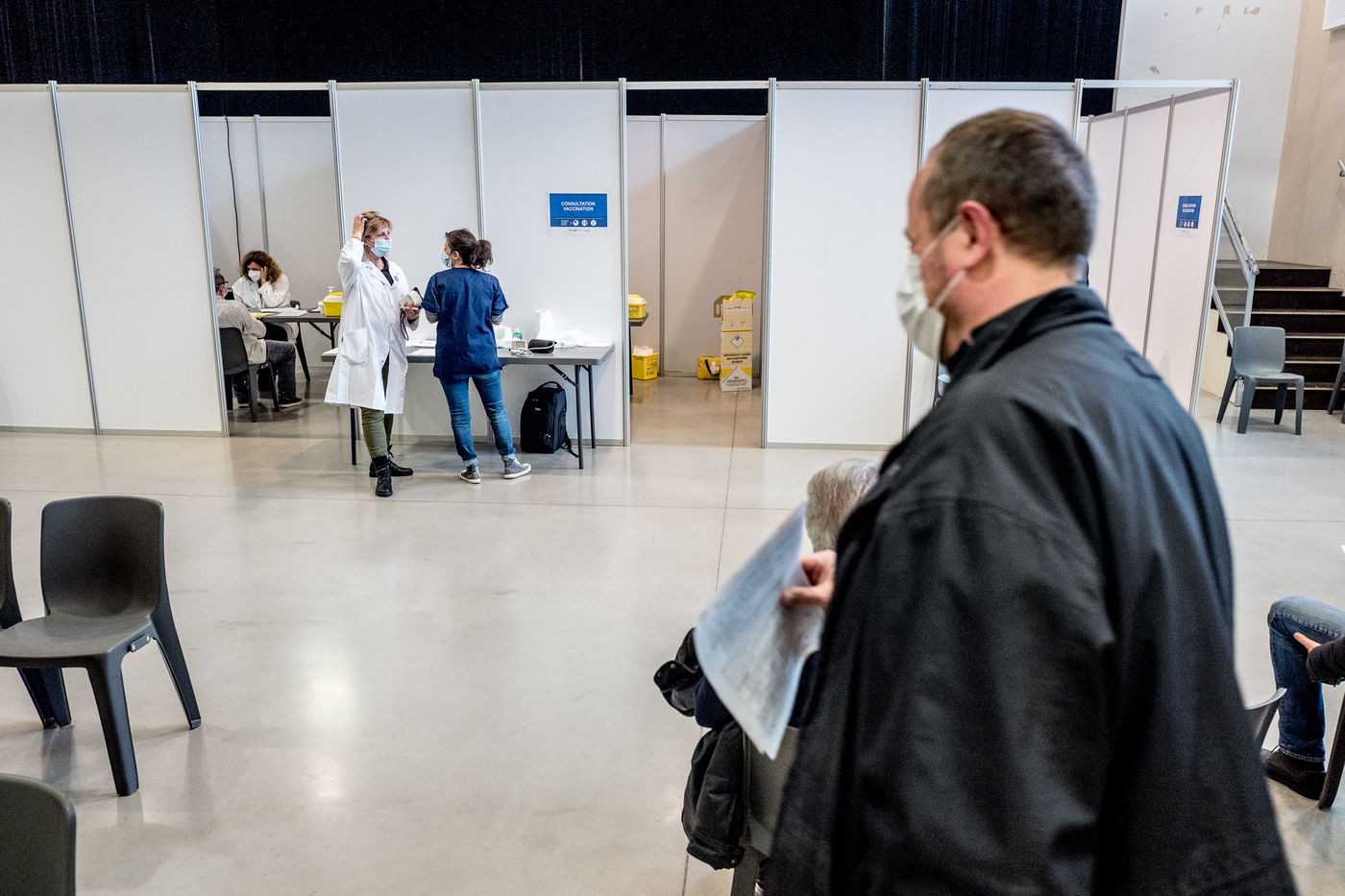 Des personnes de plus de 50 ans viennent se faire vacciner dans un centre de vaccination pour lutter contre l'épidémie du Coronavirus, Covid19.