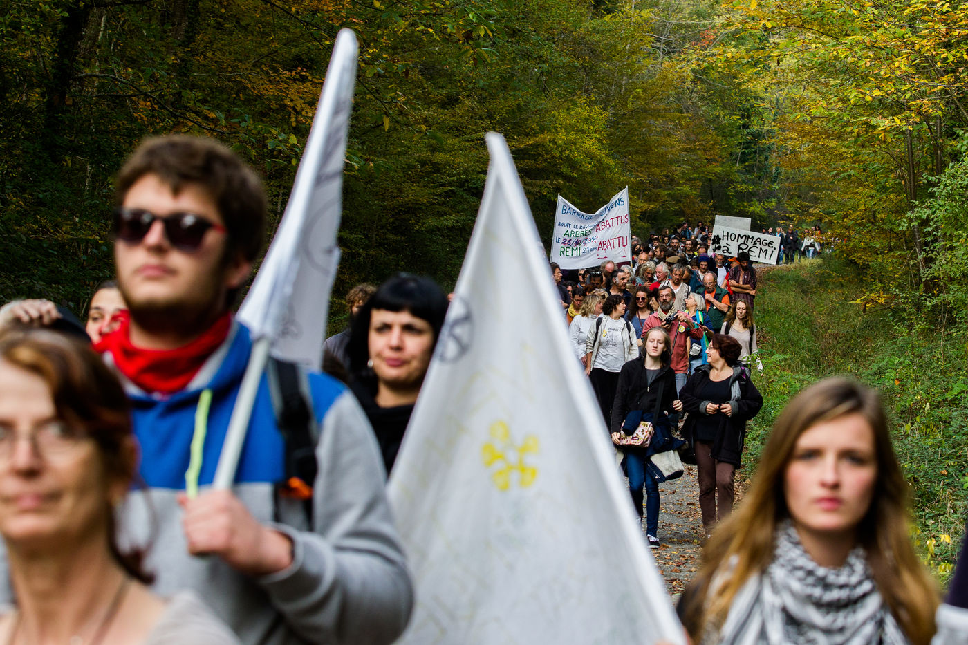 Commémoration de l'anniverssaire de la mort de Rémi Fraisse décédé d'un tir de grenade offensive dans la nuit du 25 octobre 2014 sur le chantier du projet de barrage dans la forêt de Sivens dans le Tarn. Environ trois cent personnes se sont réuni devant une sculpture sur la dalle ou est décédé le jeune militant écologiste.