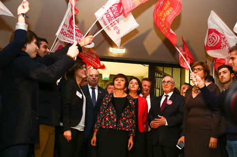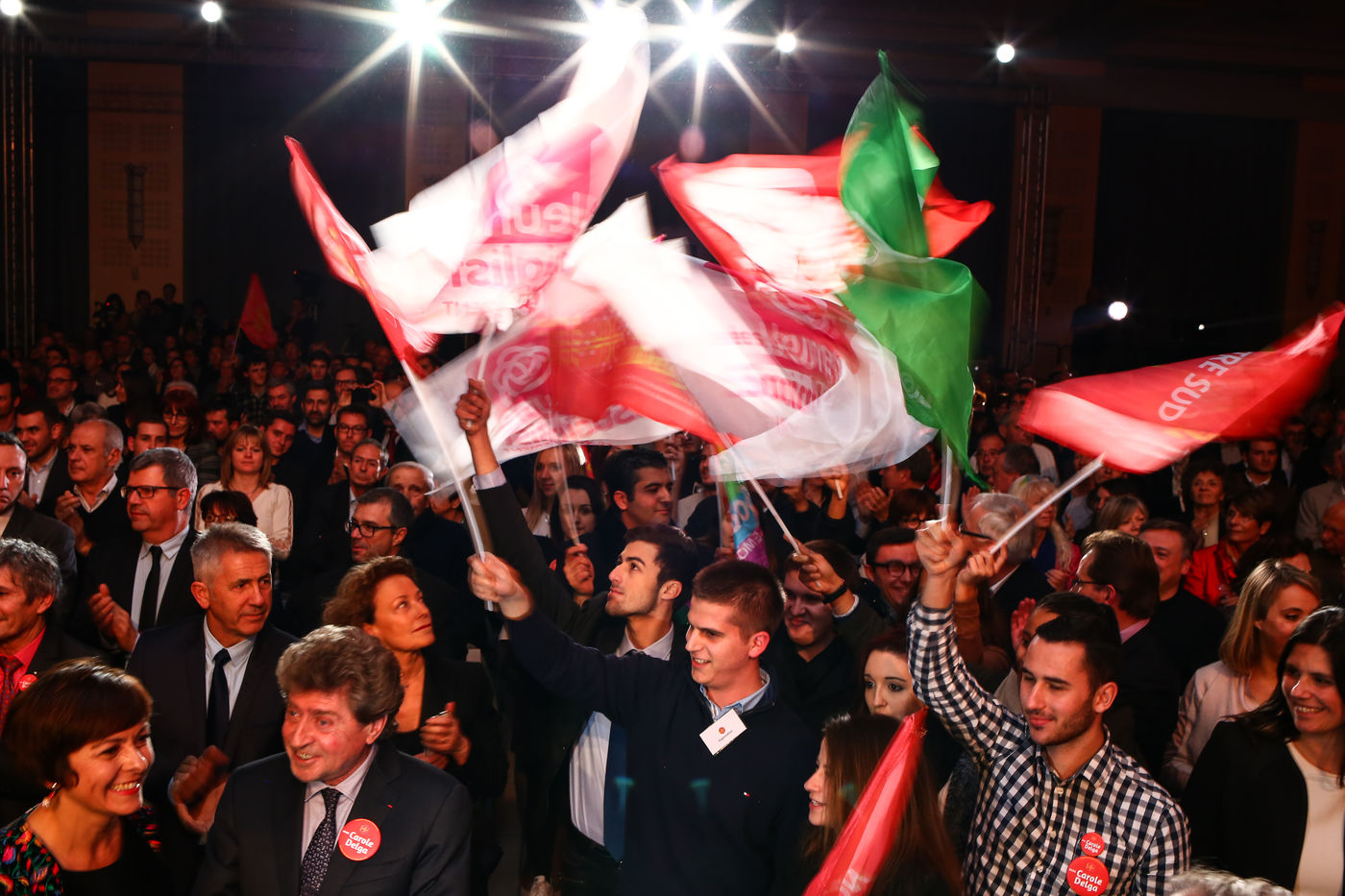 Carole Delga, la candidate de l'alliance PS/PRG/MRC Génération Ecologie a tenu un meeting régional salle Jean Mermoz devant 1500 militants venus de tous les départements de la grande région Midi-Pyrénées/Languedoc-Roussillon pour la soutenir en vue des élections régionales prévues le 6 et 13 décembre 2015.