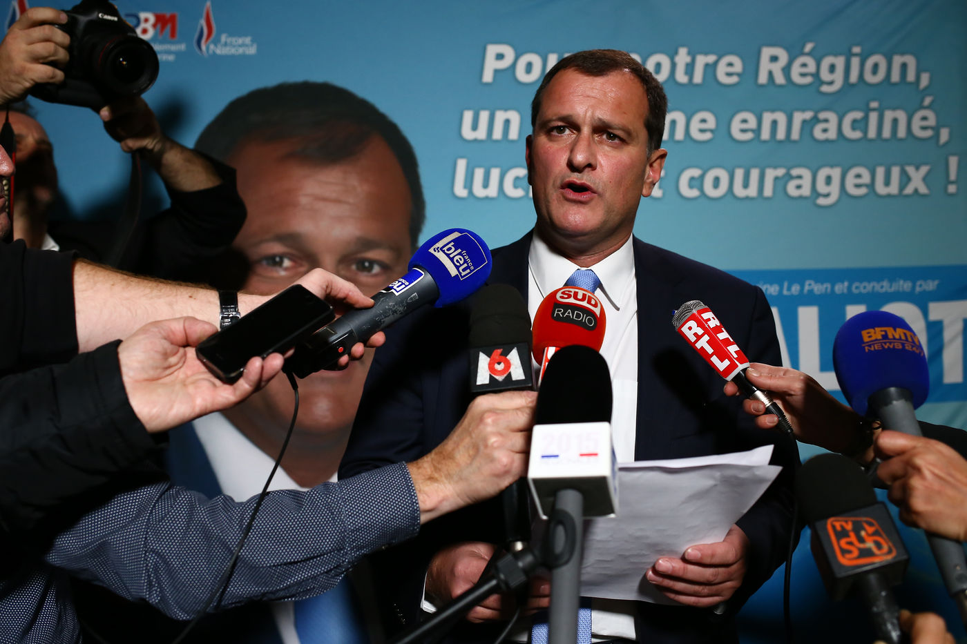 A la permanence du Front National à Toulouse, Louis Aliot candidat pour la région Languedoc-Roussillon Midi-Pyrénées- arrive en tête au premier tour des élections régionales avec 33,4% des voix.