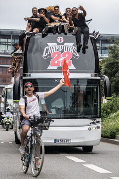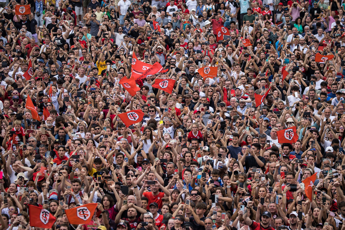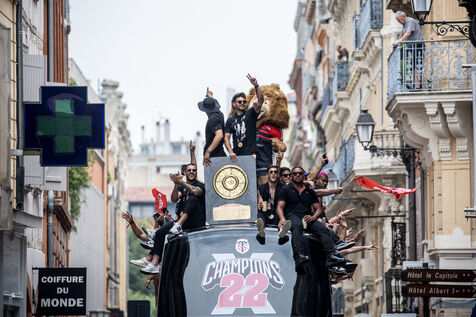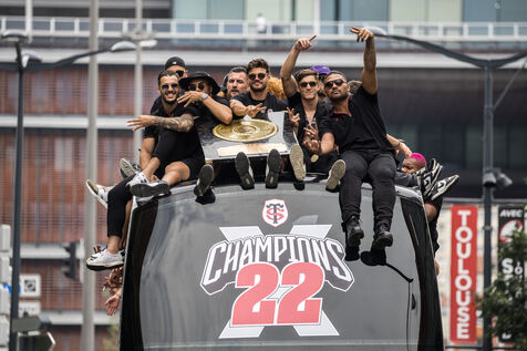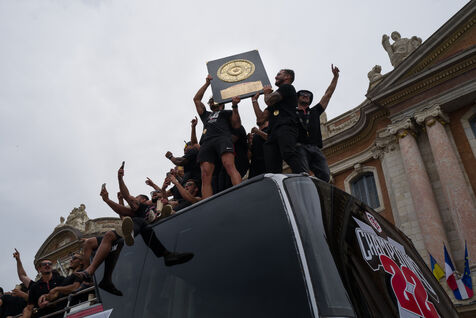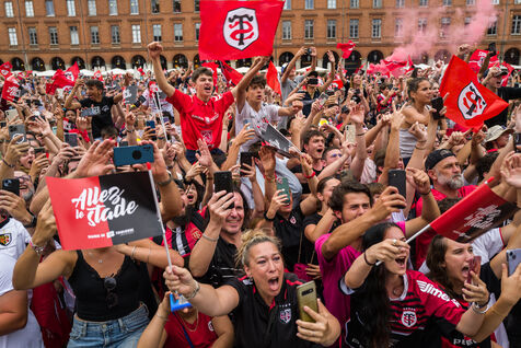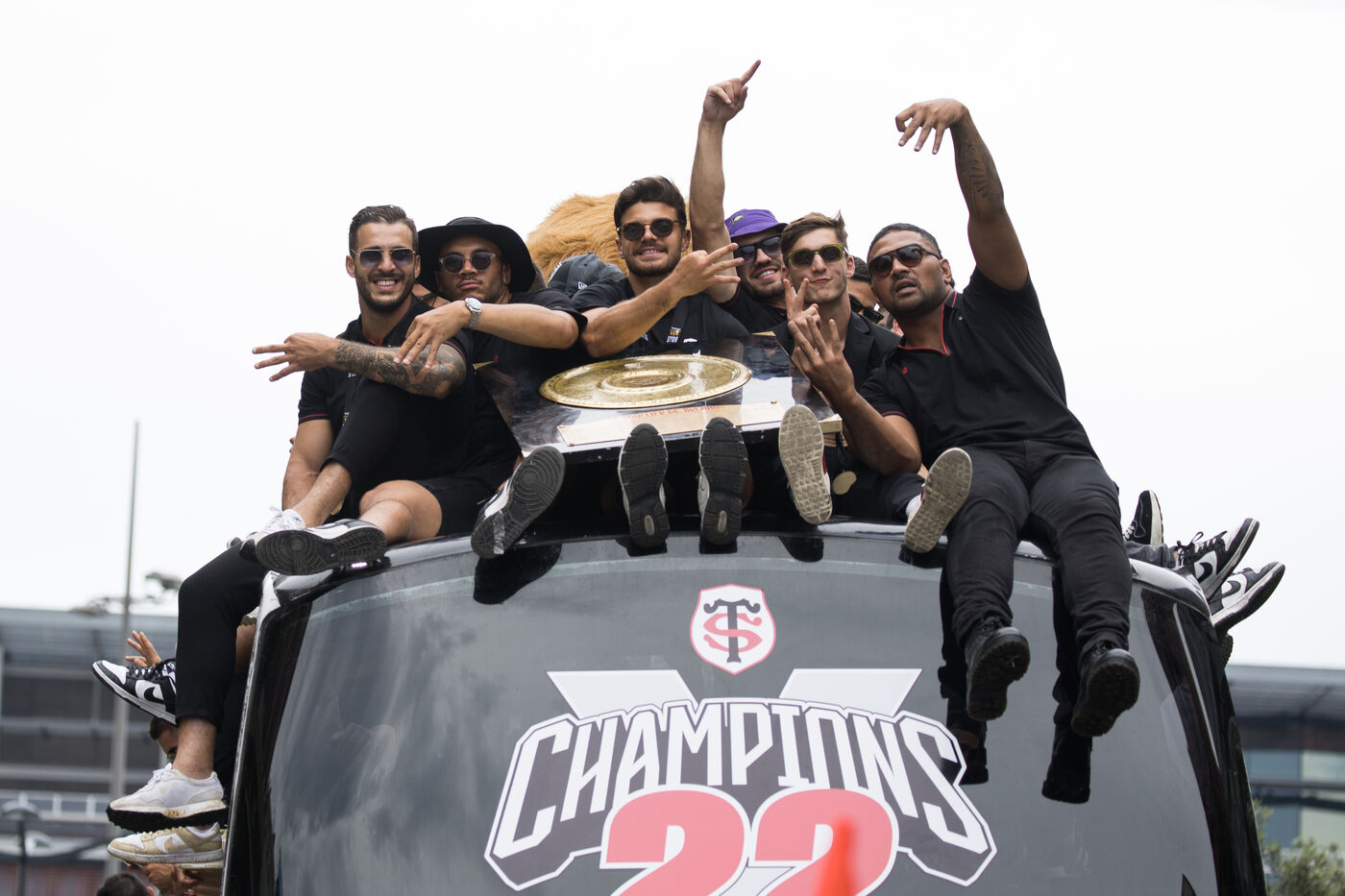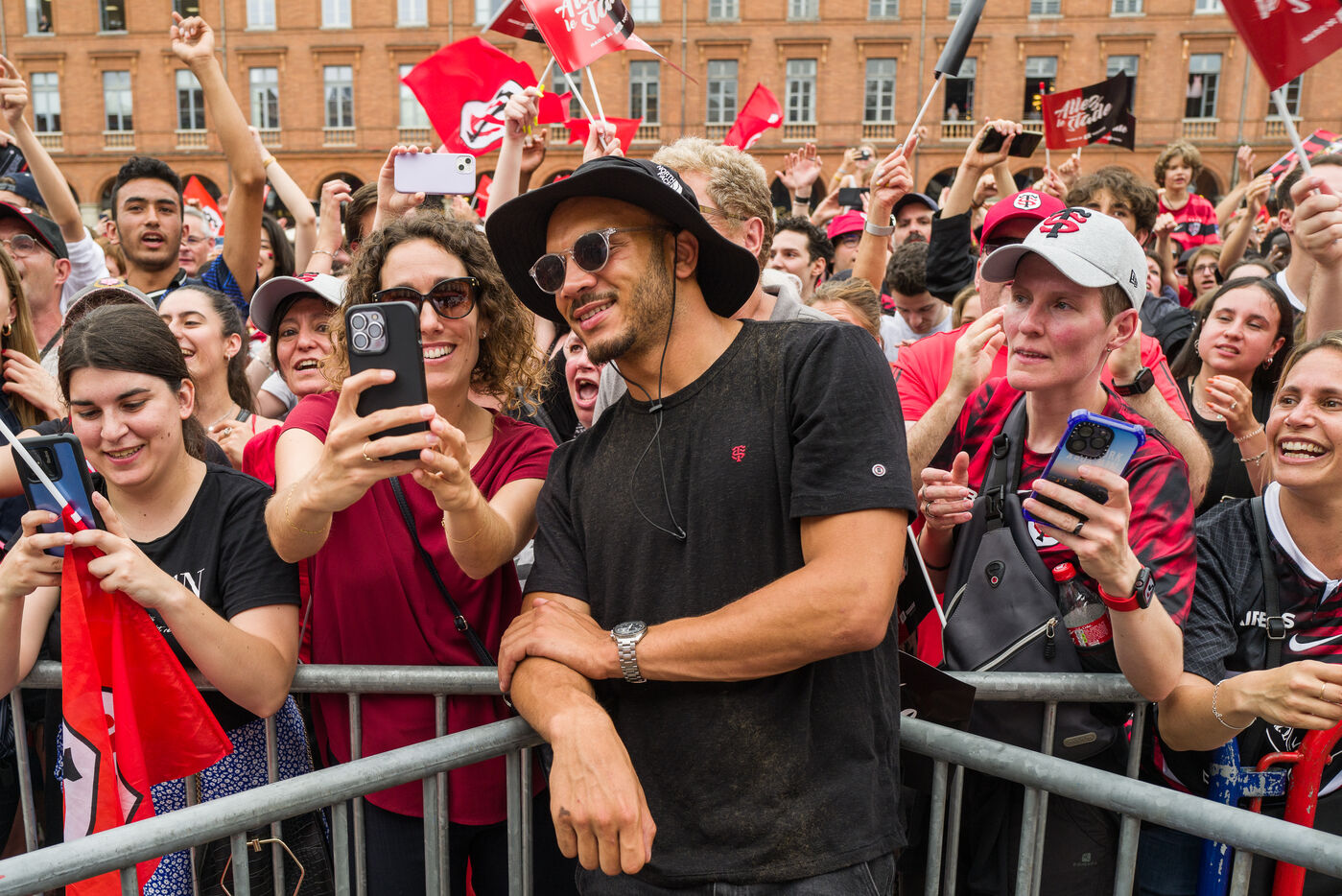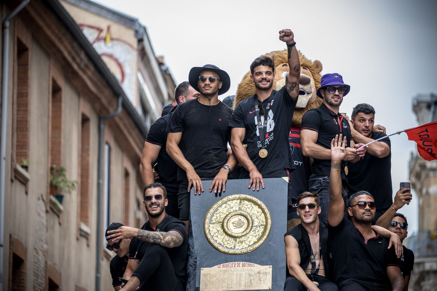 Romain Ntamack avec les joueurs du Stade Toulousain celebrent leur victoire en finale de Top14 contre la Rochelle avec les supporters en ramenant le bouclier de Brennus Place du Capitole.