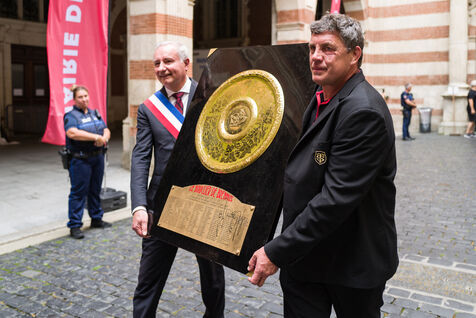 France, Toulouse, 2023-06-18. Romain Ntamack (C) with the Stade Toulousain players celebrate their victory in the Top14 final against La Rochelle with the supporters bringing back the shield from Brennus Place du Capitole.