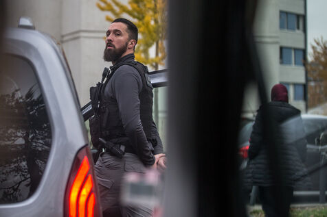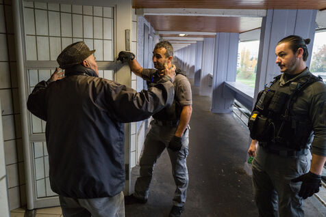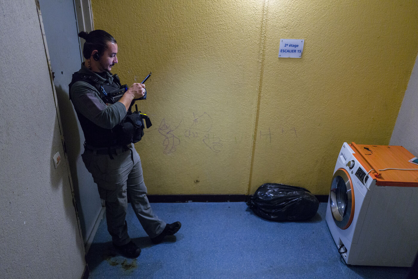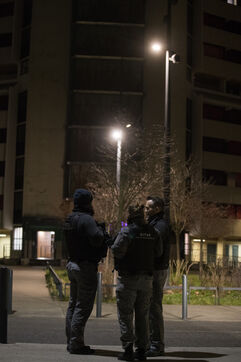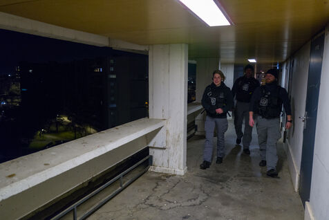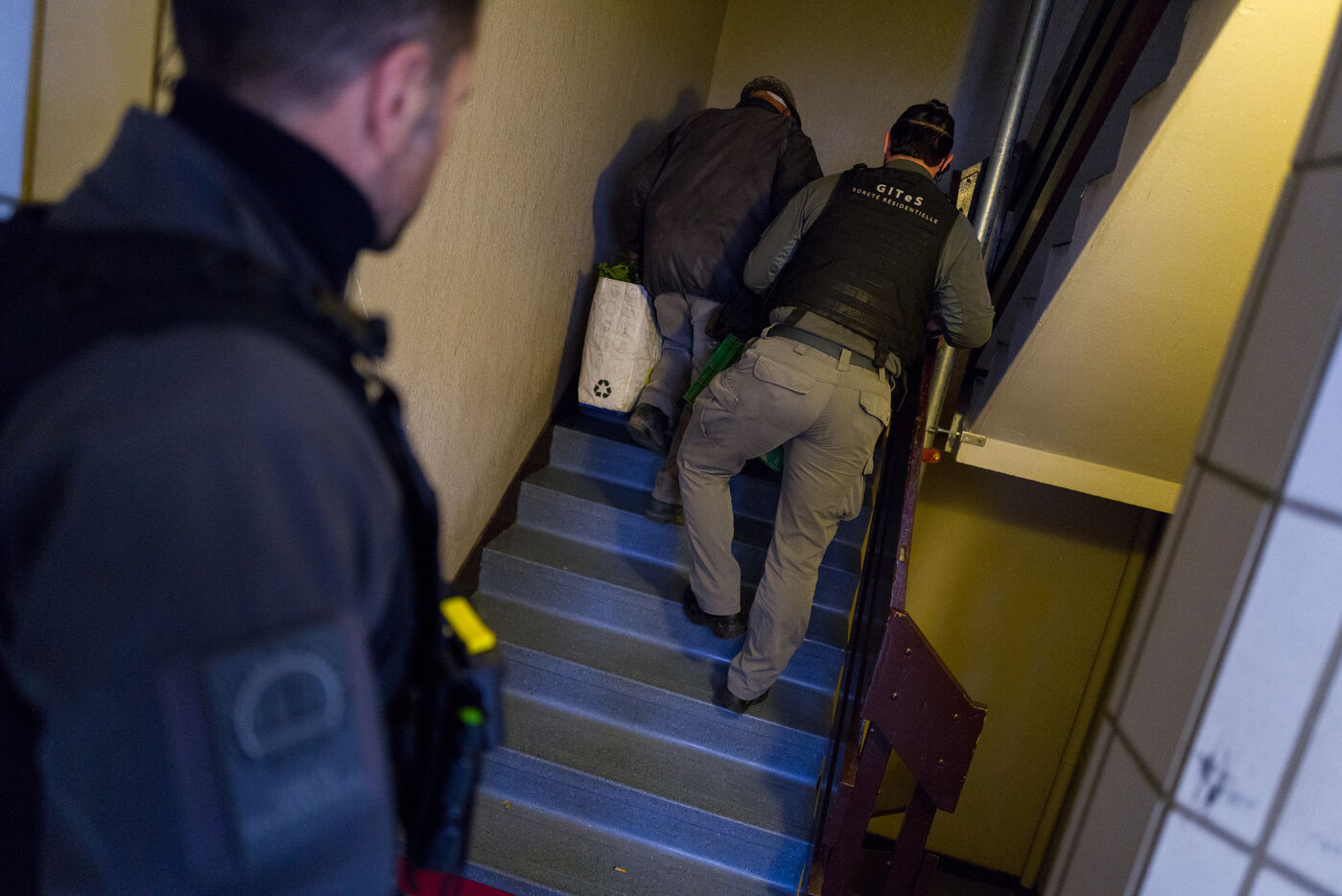 FRANCE, Toulouse, 2023-02-14. Des salariés du Groupement interquartiers de tranquillité et de sûreté(GITeS) ont en charge d'assurer la tranquilité des immeubles confiés par diffèrents bailleurs sociaux. Durant leurs patrouilles, ils sont au contact des habitants pour plus de sécurité, ils ont comme mission de gêner le traffic de stupéfiant et s"assurent de la propreté des parties communes des immeubles HLM situés dans des quartiers sensibles comme le Mirail ou le quartier de Soupetard.