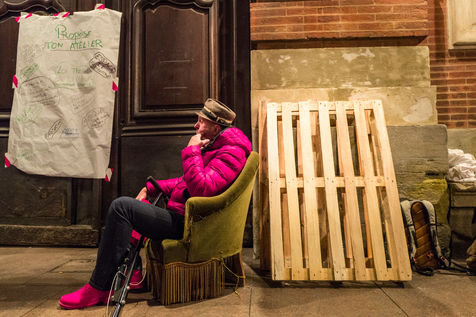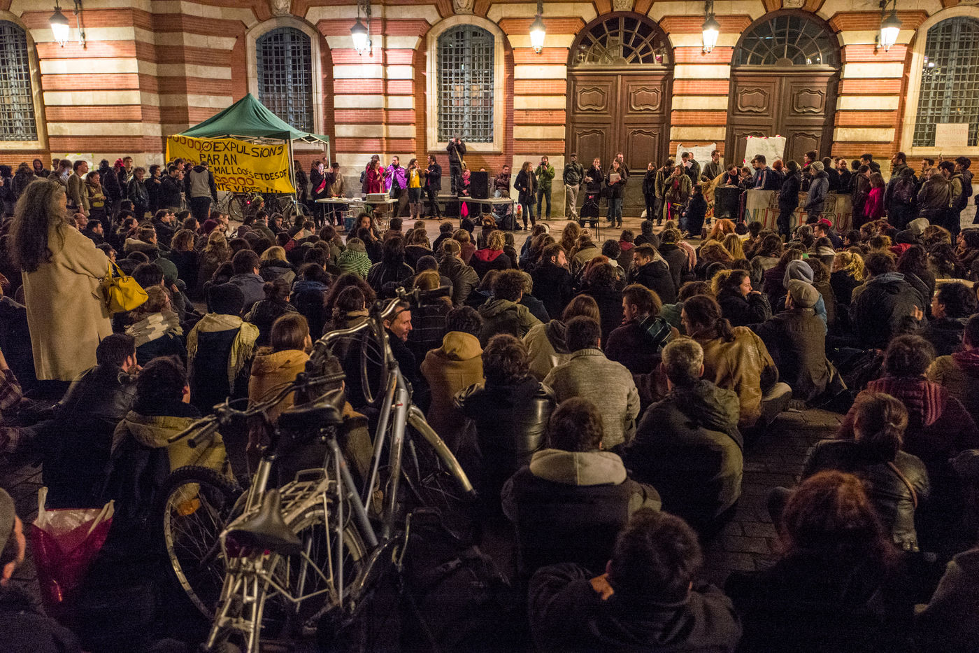 Rassemblement NUIT DEBOUT sur la place du Capitole. Depuis le 31 mars des personnes se sont installées sur différentes grandes places dans des villes de l'hexagone. Ces rassemblements pacifiques, appellés NUIT DEBOUT sont ouverts et populaires, ils visent à réinvestir l'espace public pour échanger, débattre et construire, la Place du Capitole est occupée depuis le 5 avril. 6/04/2016, Toulouse-France.