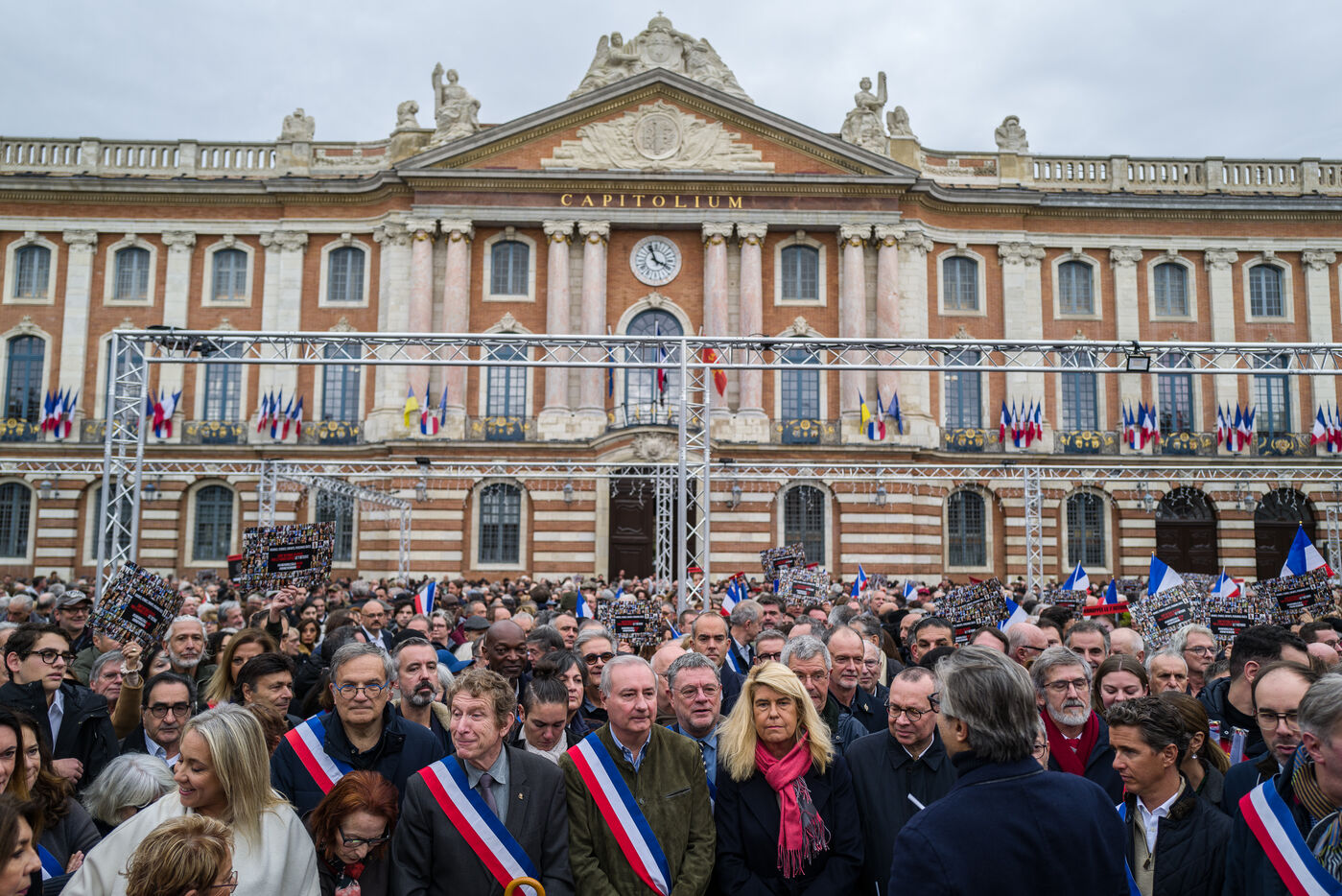 France, Toulouse, 2023-11-12. De nombreuses personnes se sont rassemblees a l appel du maire de Toulouse Jean Luc Moudenc Place du Capitole pour dire non a l antisemitisme, ils ont observes une minute de silence et ont chante la Marseillaise.