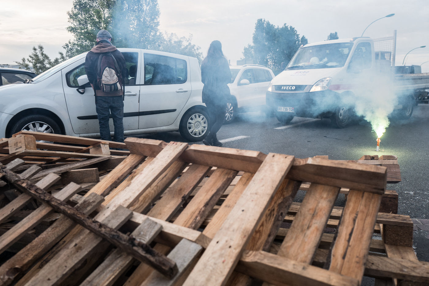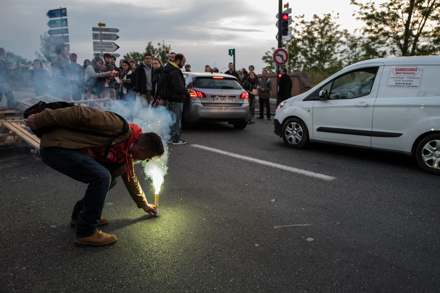 Très tôt le matin, plusieurs dizaines de manifestants, notamment du mouvement Nuit Debout, ont effectué des barrages filtrants aux sorties de rocade comme ici à Balma-Gramont pour dénoncer la loi Travail voulue par le gouvernement de Manuel Valls et de sa ministre du travail Myriam El-Khomri. De nombreux ralentissements et bouchons ont été enregistré alors que devait se tenir la grande manifestation à l?appel de l?intersyndicale dans l?après-midi.