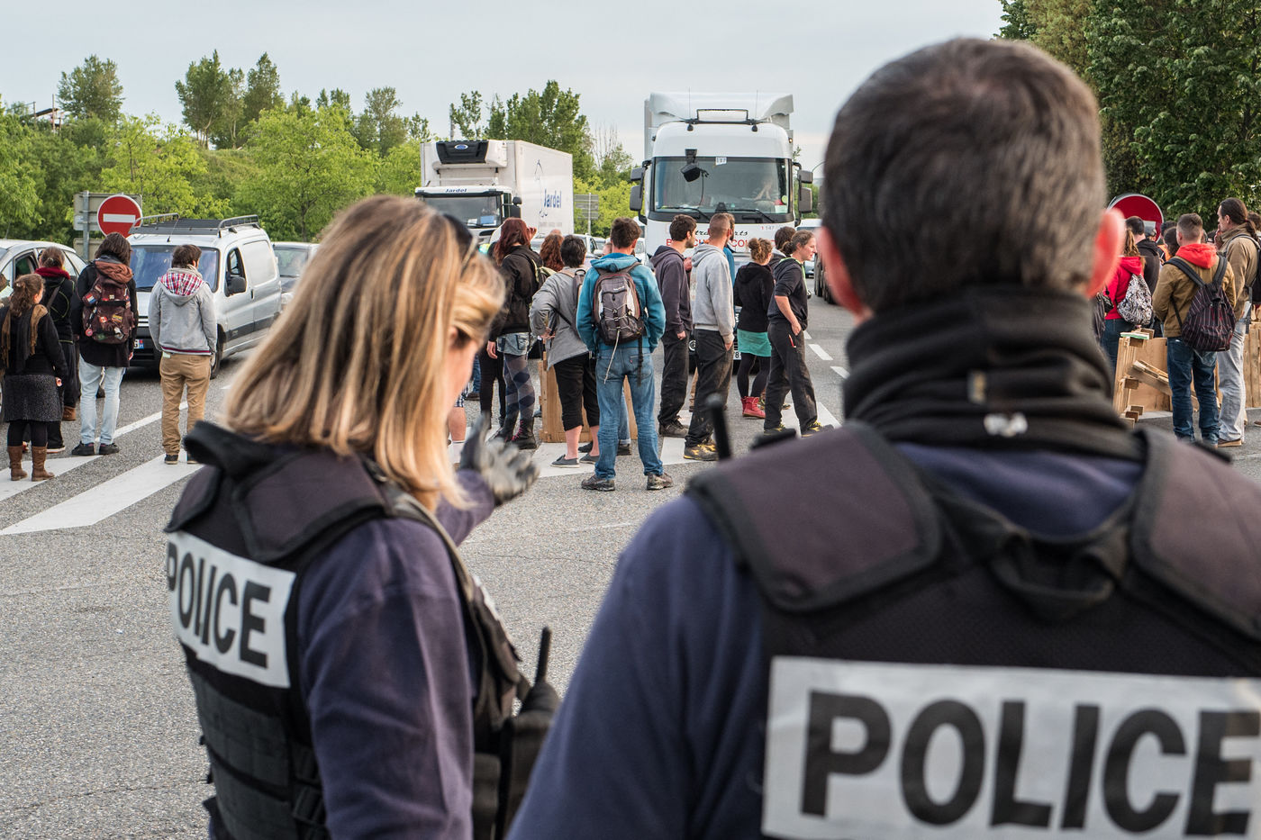 Early in the morning , several dozen protesters , including the movement Night Stand , conducted filter dams to bypass outputs as here in Balma - Gramont to denounce the work required legislation by the government of Manuel Valls and his Minister of Myriam work El- Khomri . Many slowdowns and closures were recorded while was to take the big demonstration called by the Inter in the afternoon . Toulouse, France - May 26, 2016