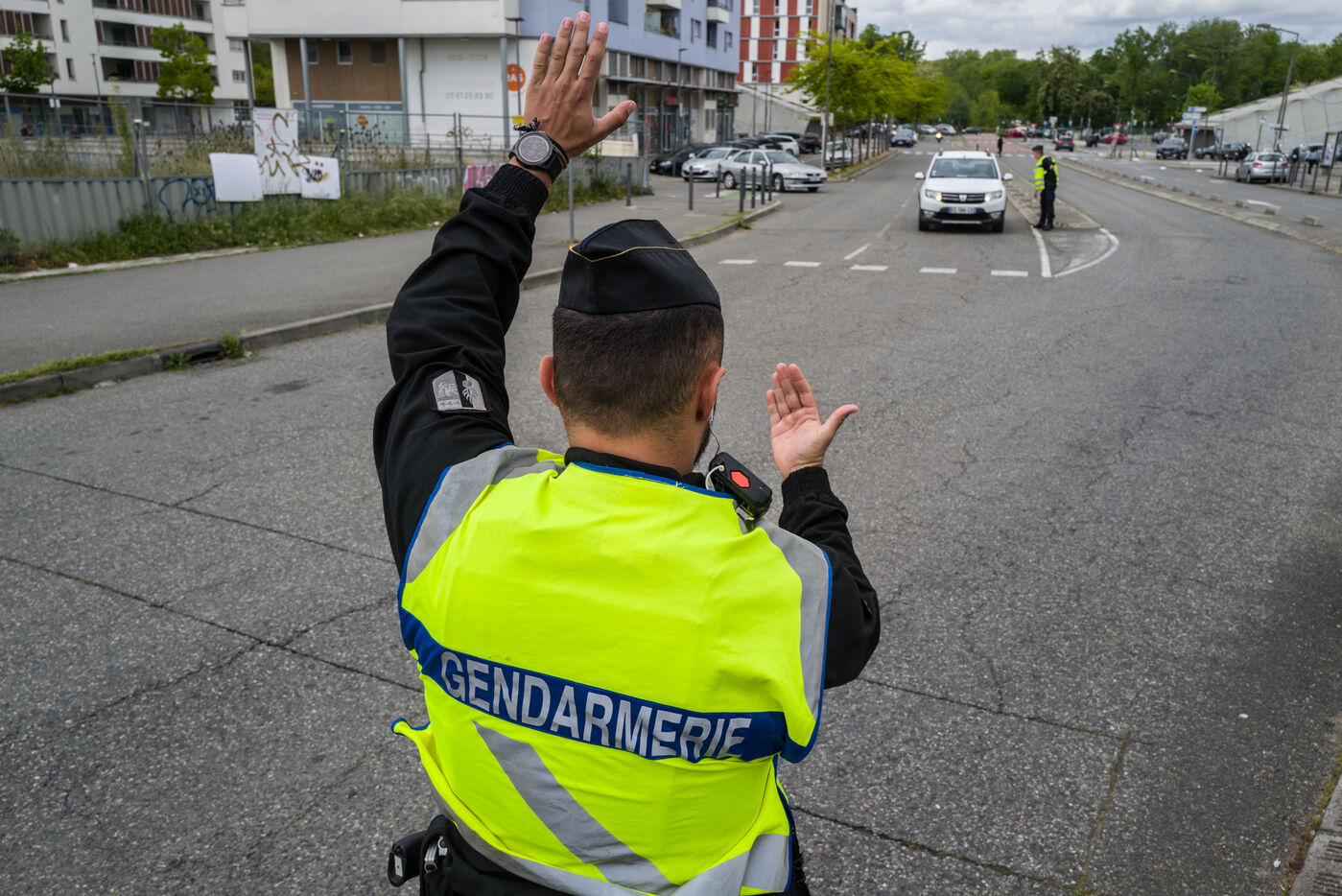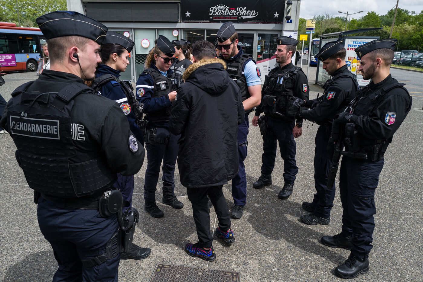 Gendarmes carry out identity checks and searches for narcotics near the Ramonville metro station in the suburbs of Toulouse as part of Operation XXL desired by the government with the presence of a strong police presence to visibly fight against the delinquency and the feeling of insecurity. April 25, 2024, Ramonville France.
