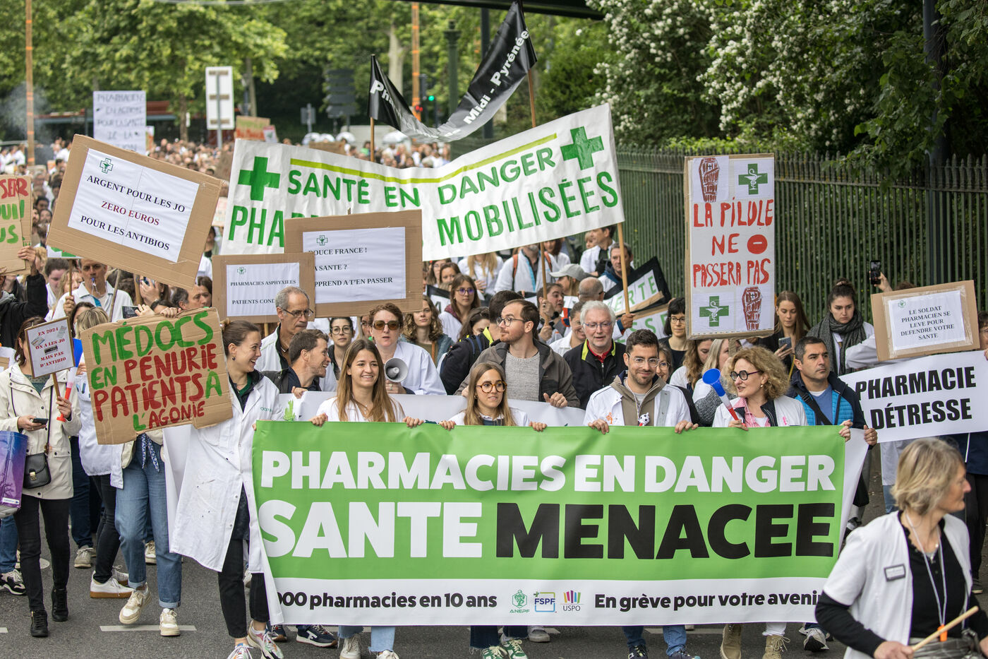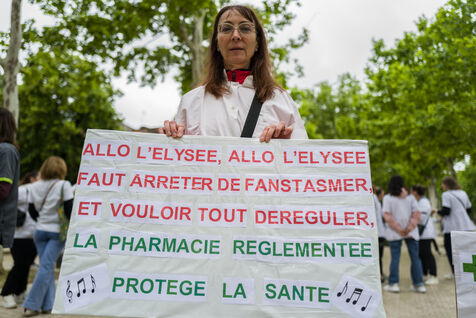 Manifestation des pharmaciens, les syndicats des pharmaciens d officine ont lance un mouvement national de greve pour la journée du 30 mai 2024, ils reclament une revalorisation financiere et protestent contre les penuries de medicaments et s inquietent de rumeurs de deregulation du reseau officinal.