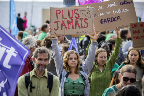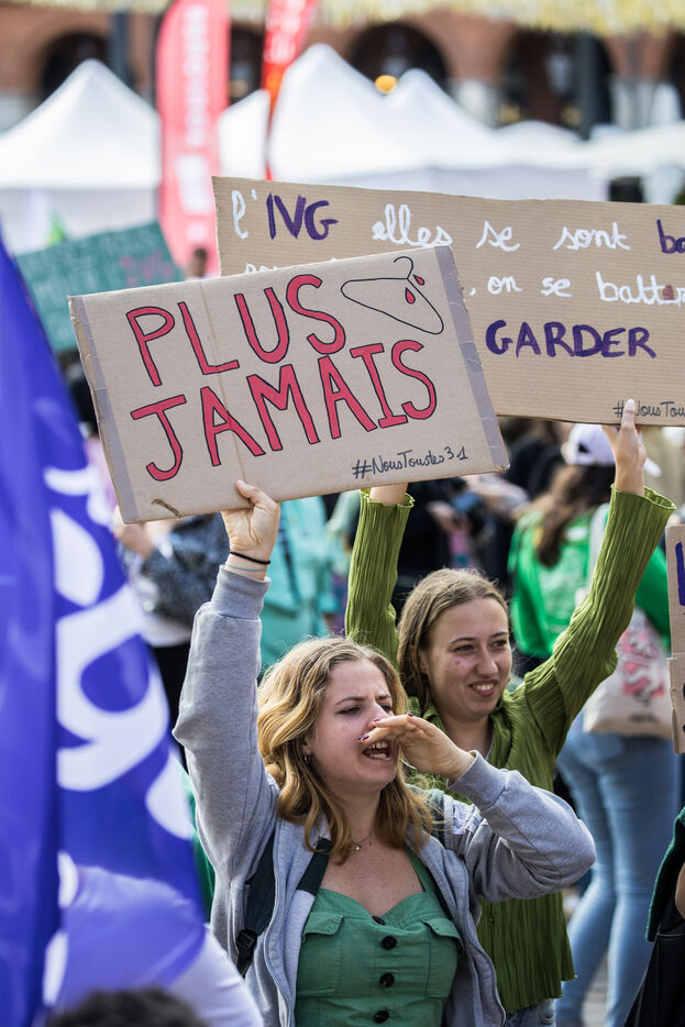 France, Toulouse, 2024-09-28. Des personnes manifestent sur la place du Capitole pour denoncer le baisse de subventions du Planning Familial par le conseil regional d Occitanie.