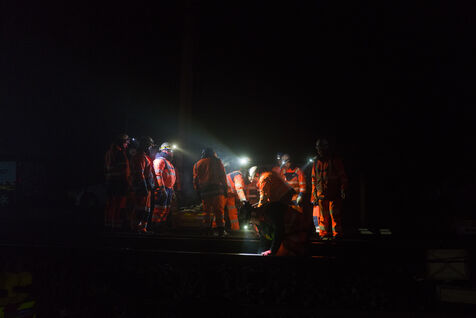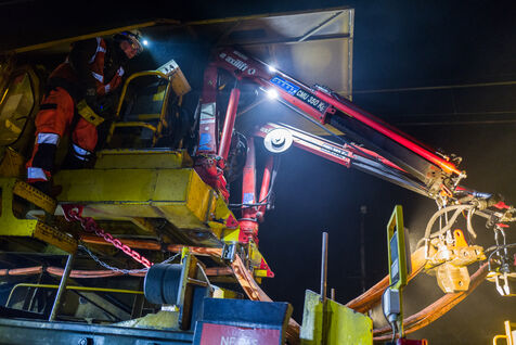 France, Baziege, 2025-01-17. SNCF Reseau is carrying out a night-time construction site on the railway between Toulouse and Castelnaudary in the south of France, using a factory train called the Boa and involving more than 100 employees.