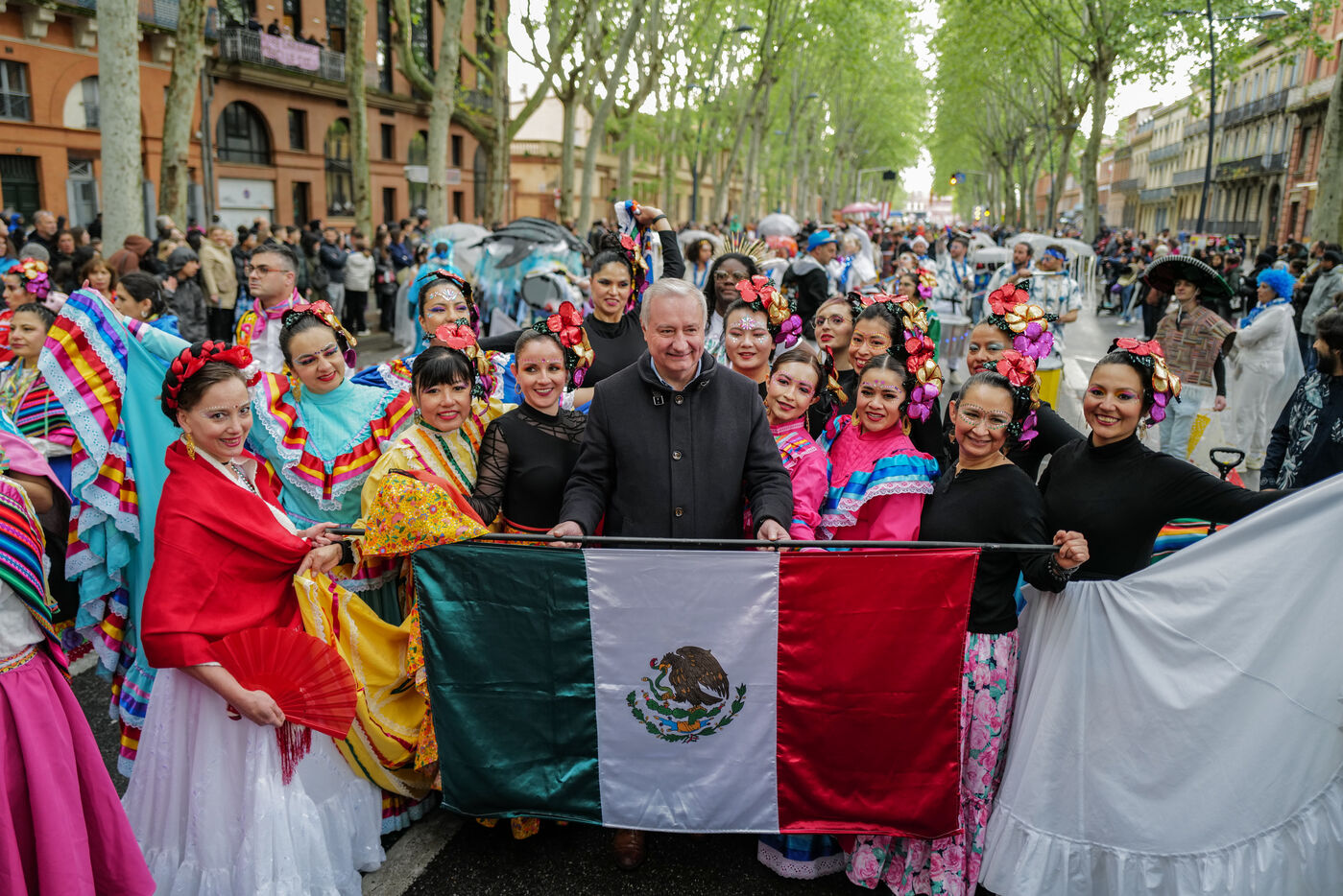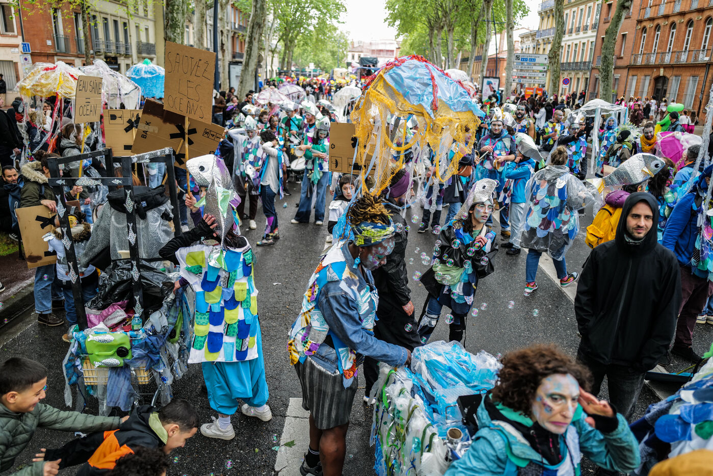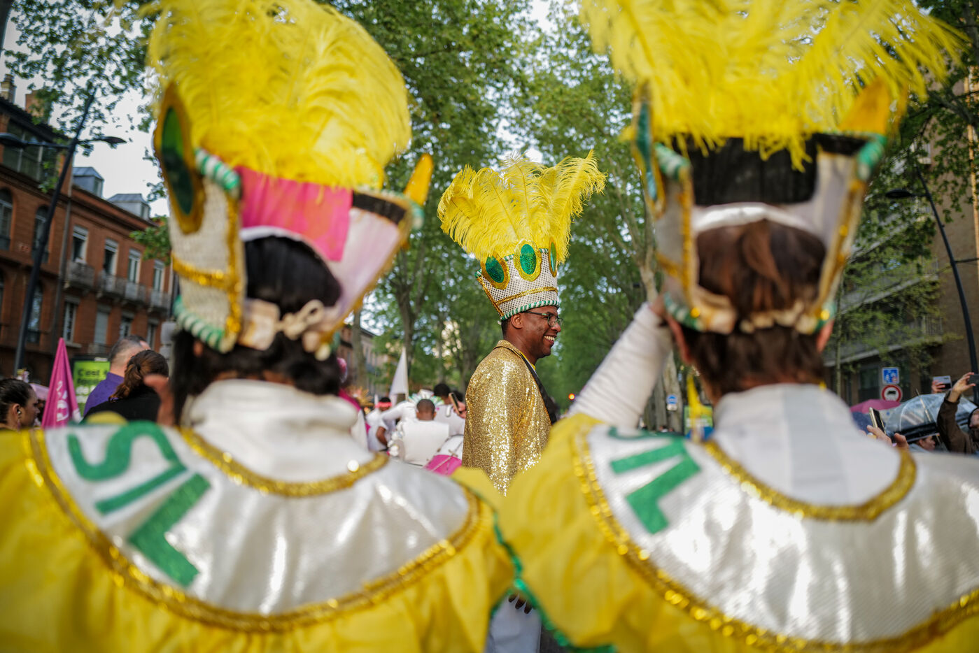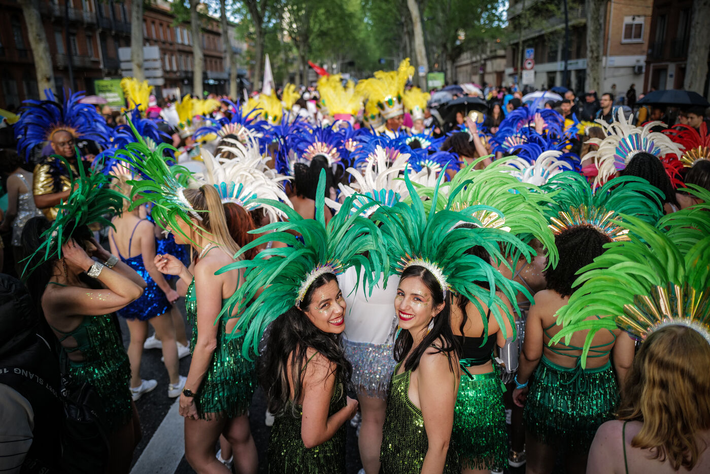 France, Toulouse, 2025-04-19. Festive and colorful atmosphere takes place in the streets of downtown Toulouse in the south of France during the Toulouse Carnival organized by the Unified Carnival Organization Committee (COCU).