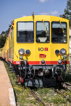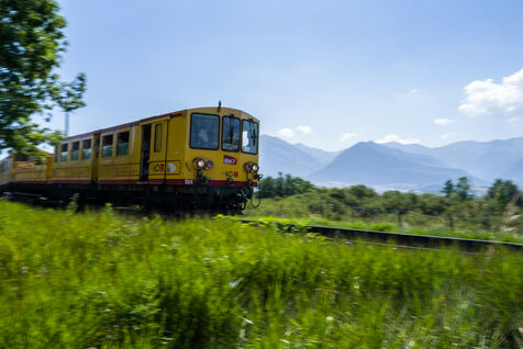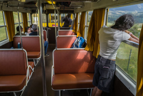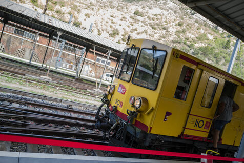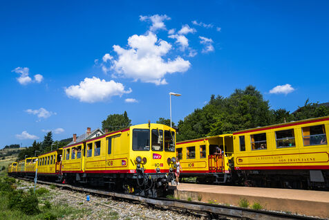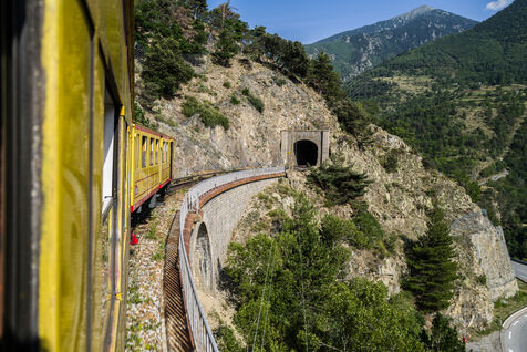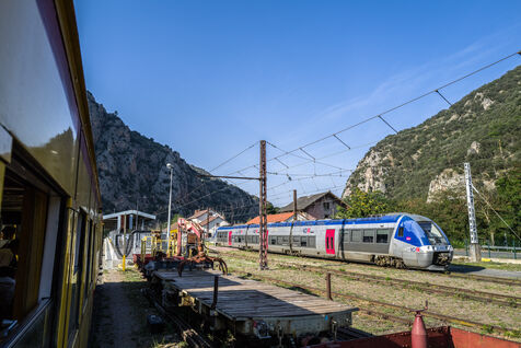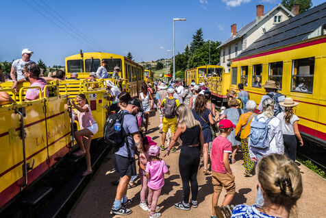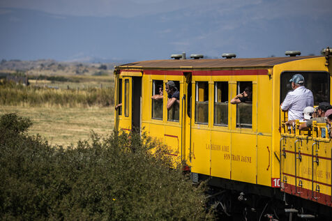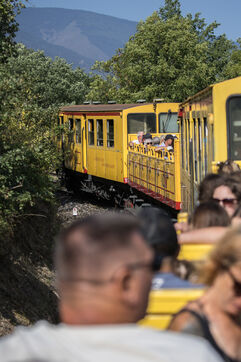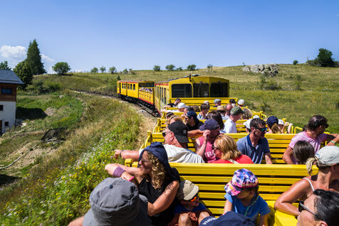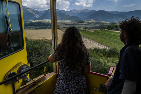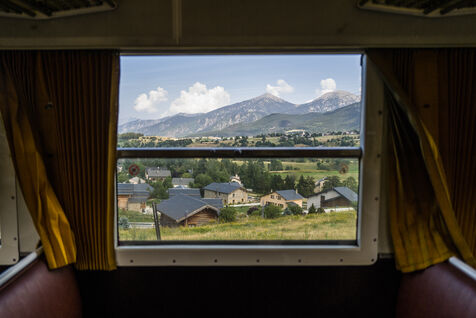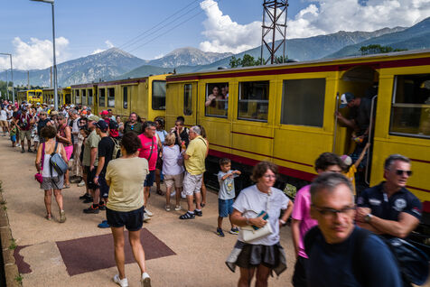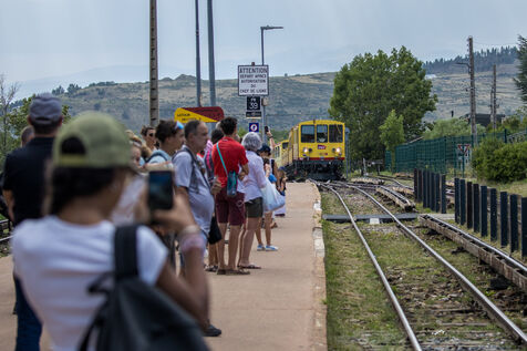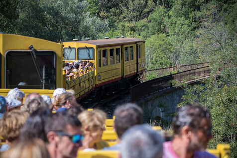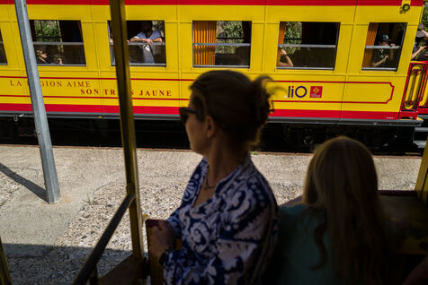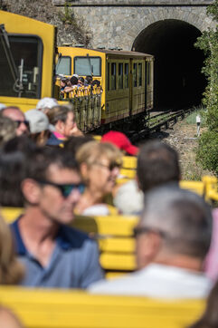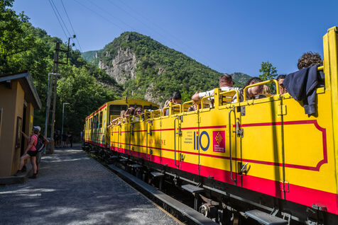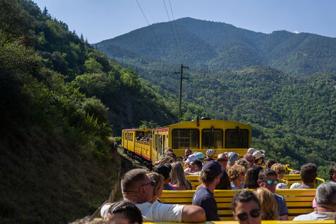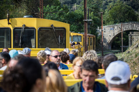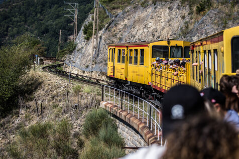 Tourists in the Yellow Train, also known as the Cerdagne line, this 62.5 km railway line in the Pyrénées-Orientales department connects Villefranche-Vernet-les-Bains station to Latour-de-Carol-Enveitg station via Font-Romeu.