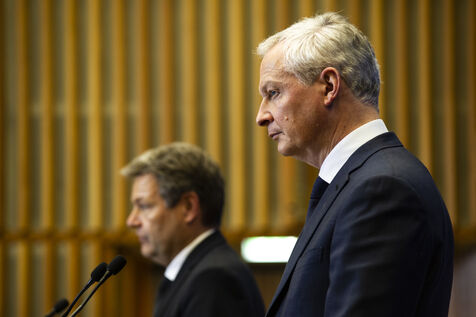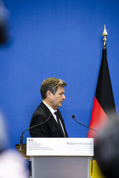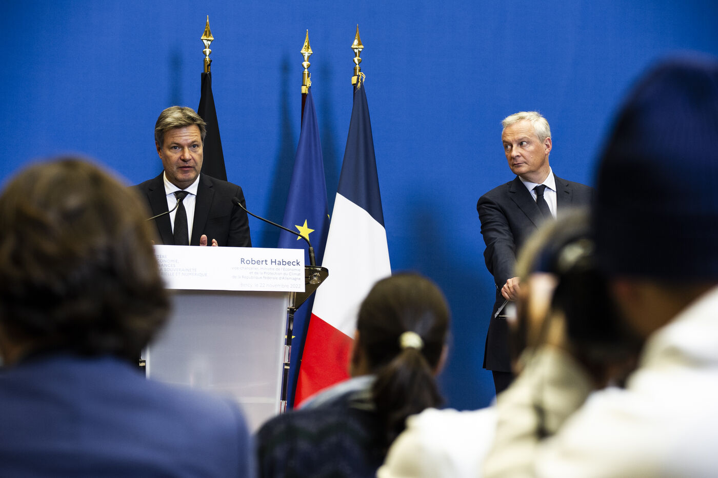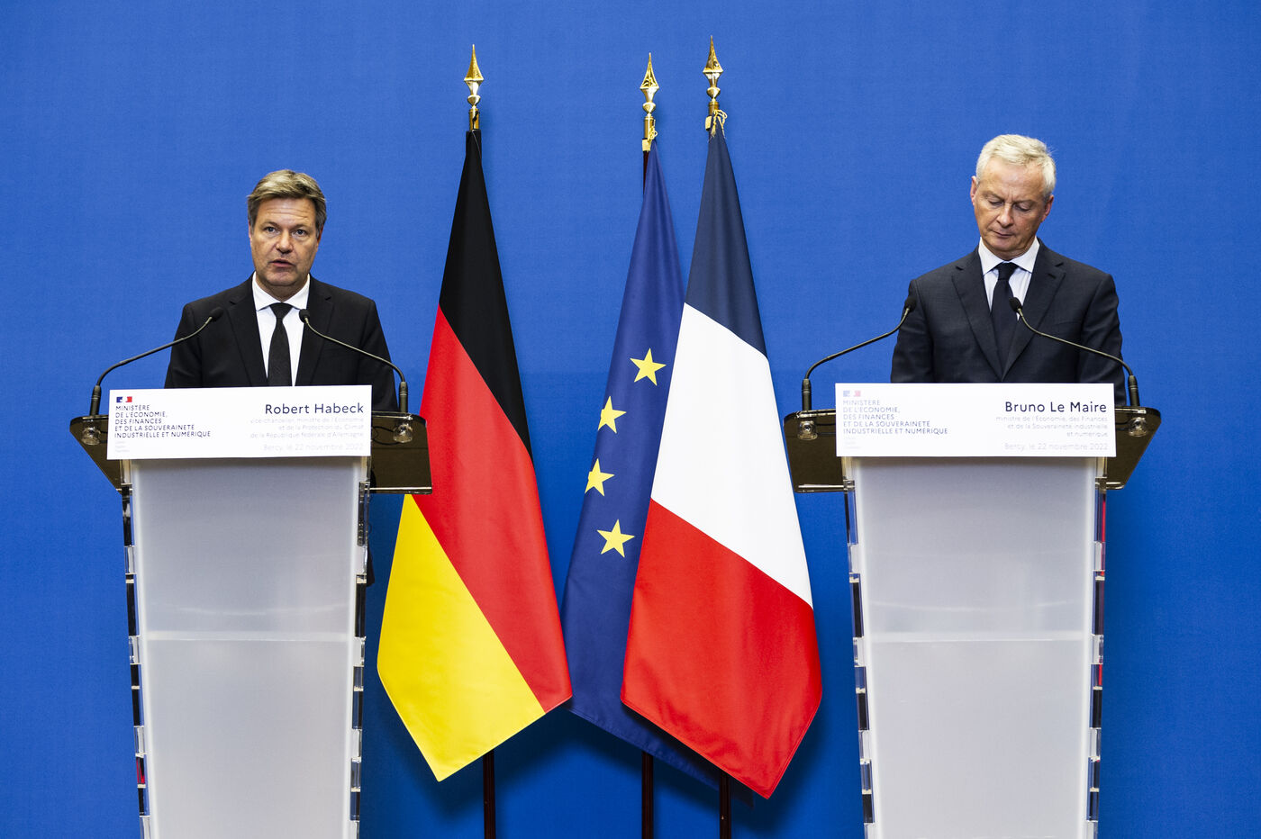 Point presse de Bruno Le Maire, ministre de l Economie, des Finances et de la Souveraineté industrielle et numérique, et Robert Habeck, vice-chancelier, ministre de l'Économie et de la Protection du Climat de la République fédérale d Allemagne suite à leur réunion de travail au ministère de l'Économie et des finances à Bercy
