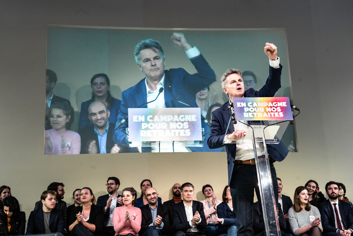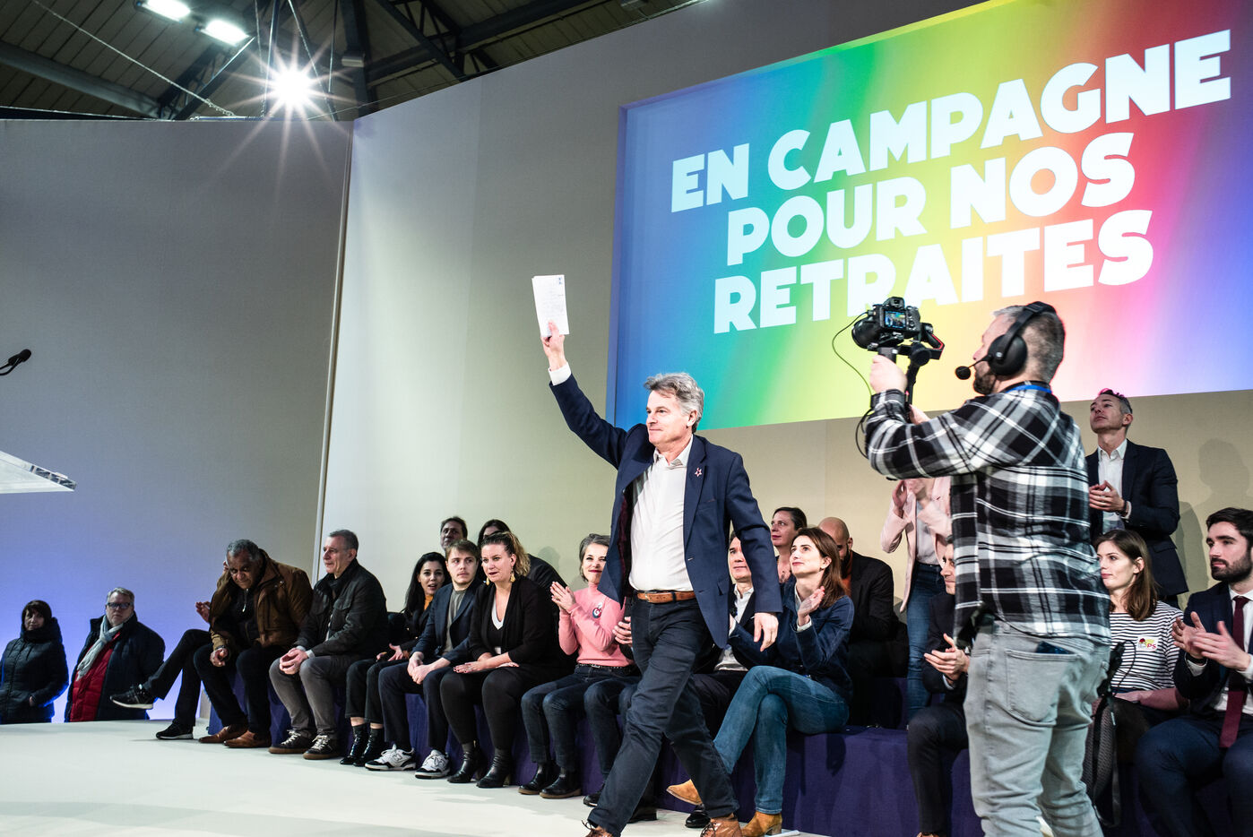 Meeting de la NUPES au gymnase Japy suite à la nouvelle réforme des retraites mit en place par le gouvernement qui recule l'âge légal de départ à la retraite à 64 ans.