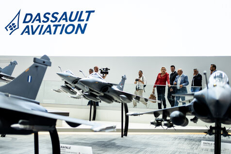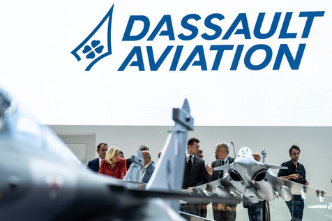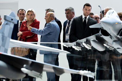 Marine le Pen et Jordan Bardella lors d'une visite à la 55e édition du Salon international de l'aéronautique et de l'espace à l'aéroport de Paris-Le Bourget, au Bourget, dans la banlieue de Paris.