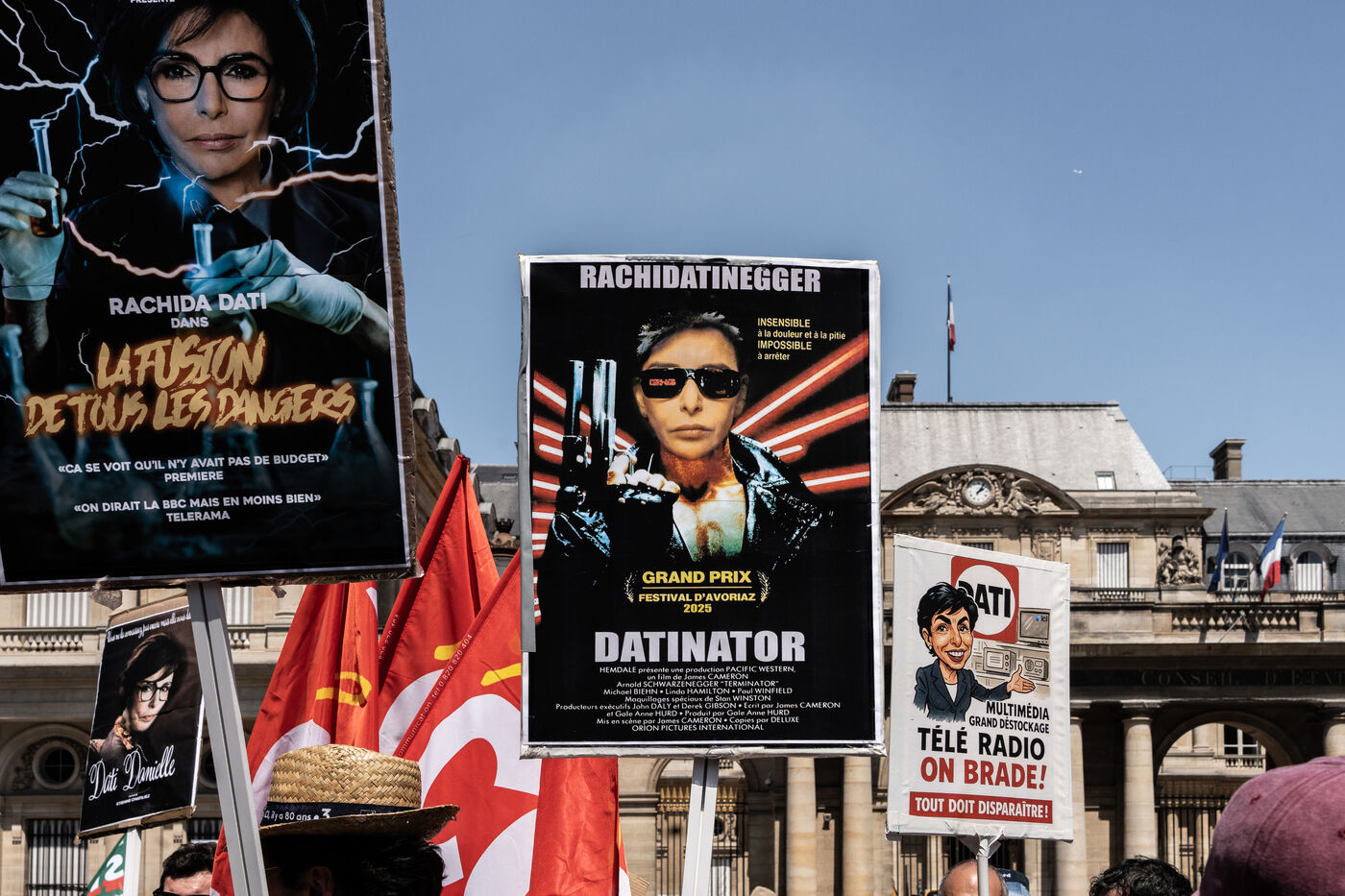 Manifestation contre la réforme de l’audiovisuel public appelée par la CGT, les salariés en grève de Radio France, France Télévisions, l’INA et France Médias Monde. Ce texte de loi défendu par la ministre de la Culture Rachida Dati est examiné à l’Assemblée Nationale ce lundi 30 juin.