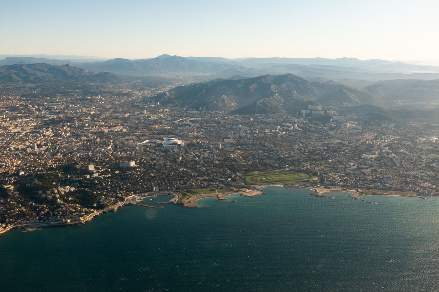 Vues aériennes de la ville de Marseille et son littoral depuis un vol Londres-Marseille le 3 décembre 2021.