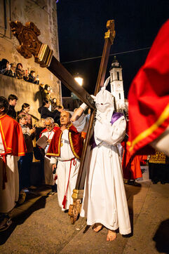 Le pénitent rouge, anonyme, porte la croix et les chaînes. Il chute, se relève, soutenu par le pénitent blanc. Ensemble, ils incarnent le poids de la faute, l’effort de la rédemption et la foi silencieuse. À leurs côtés, les confrères en cape rouge forment une procession dense, rythmée par les chants, le silence, et la gravité des regards.