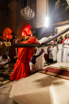 The anonymous red penitent carries the cross and chains. He falls, rises again, supported by the white penitent. Together, they embody the weight of guilt, the effort of redemption, and silent faith. Beside them, the brothers in red capes form a dense procession, paced by chants, silence, and the gravity in their eyes.