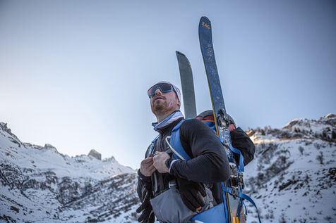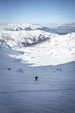 Une journée de randonnée à ski alpinisme dans le massif de la Pierra Menta. Les conditions nivologiques très sèches de cette année modifient grandement le cheminement et obligent à porter souvent les skis.