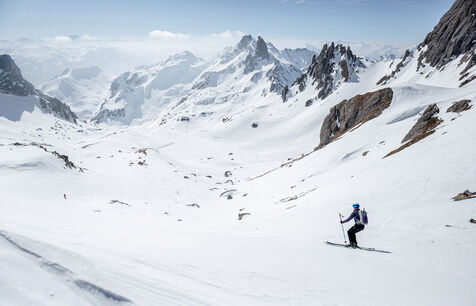 A day of ski touring mountaineering in the Pierra Menta massif. The dry conditions of this year alter the route. The skis have to be carried on many passages.