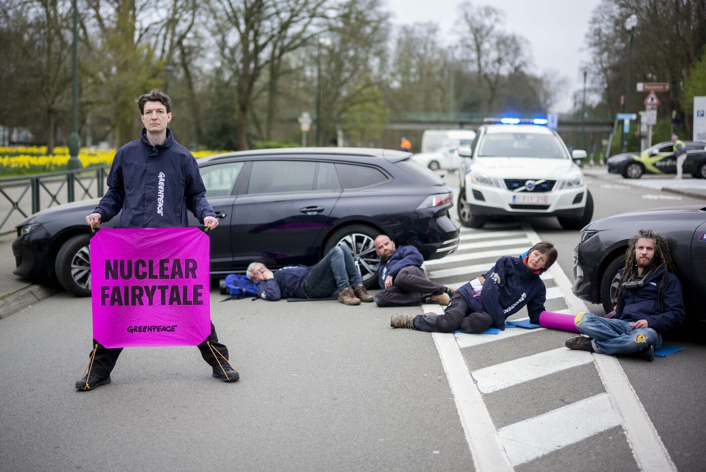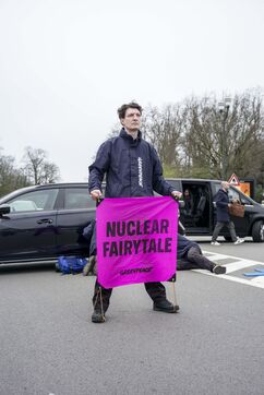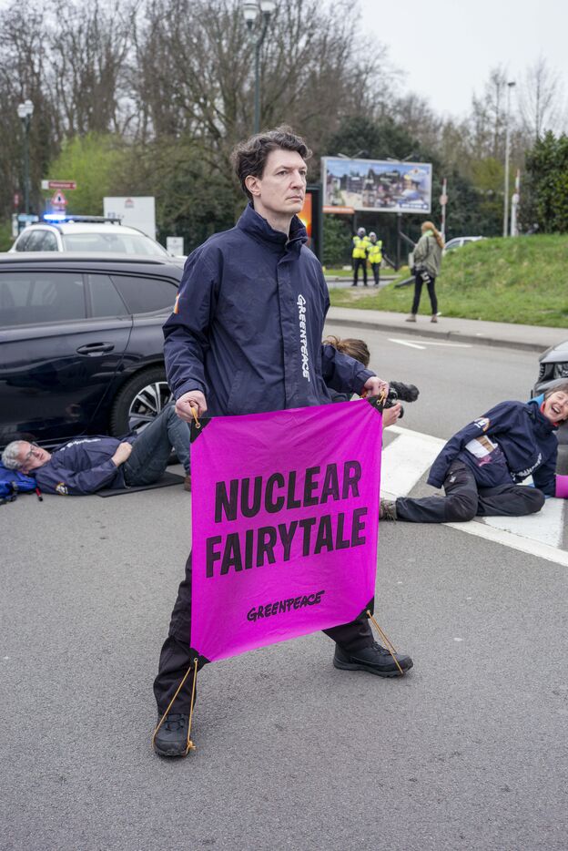 Belgique, Bruxelles, le 21/03/2024. Des activistes climat dénoncent les fantasmes d?E. Macron sur le nucléaire et perturbent un sommet pro-nucléaire à Bruxelles. Alors que le Sommet sur l?énergie nucléaire réunissant chefs d?État et industriels du secteur se tient à Bruxelles, des activistes représentant une quarantaine d?organisations du monde entier dénoncent une réunion déconnectée de la réalité, perpétuant le vieux mythe d?une énergie omnipotente qui pourrait sauver le climat. Emmanuel Macron, leader de l?Alliance nucléaire qui sabote depuis des mois les textes sur les énergies renouvelables au niveau européen, y est présent pour tenter de financer son « nouveau nucléaire », dont la facture est déjà hors de prix. Blocage routier, barrages, déploiement de bannière.