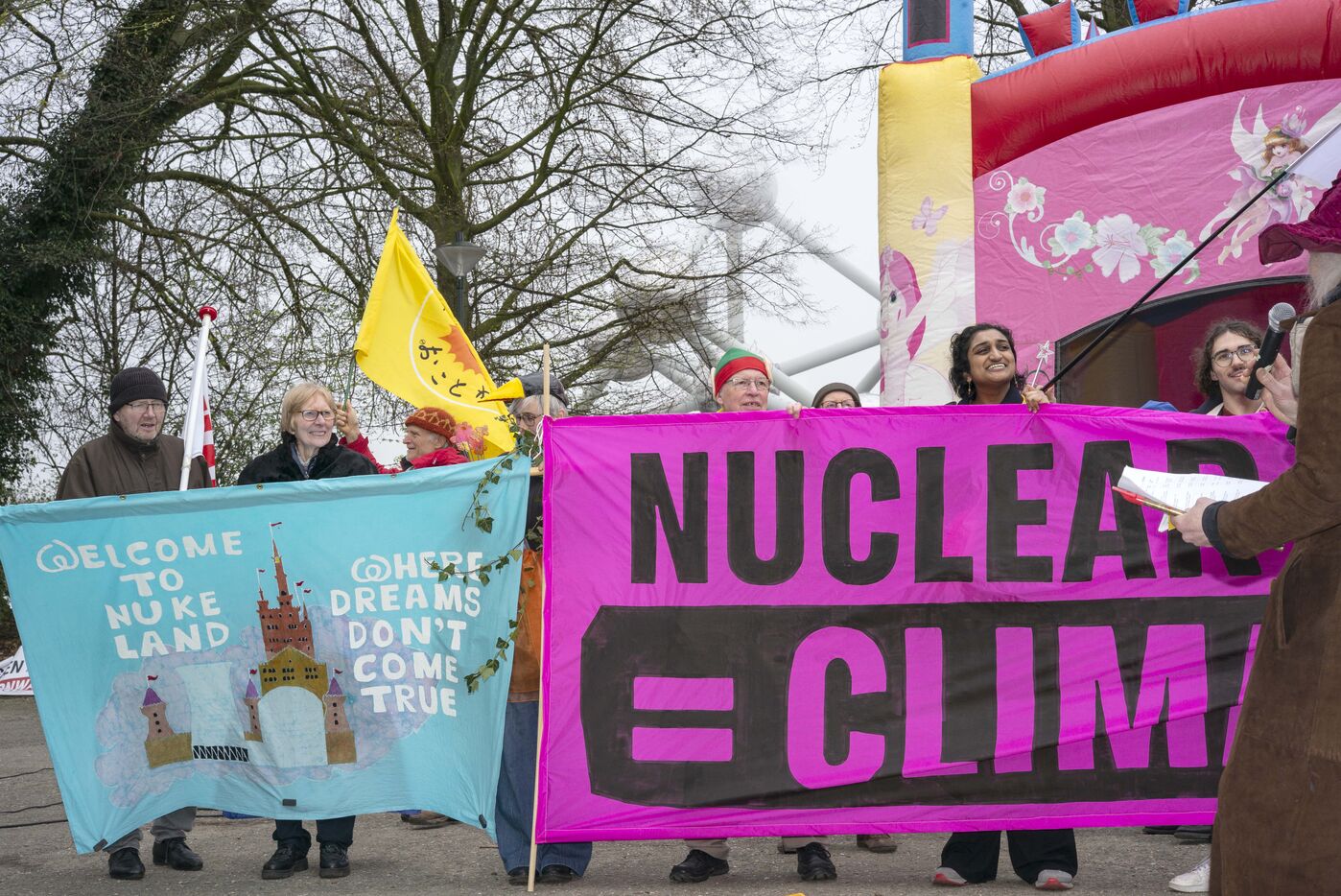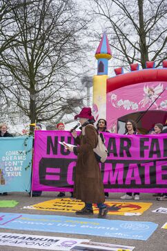 Belgium, Brussels, 21/03/2024. Climate activists denounce E. Macron's nuclear fantasies and disrupt a pro-nuclear summit in Brussels. As the Nuclear Energy Summit of heads of state and industry gathered in Brussels, activists representing some forty organizations from around the world denounced a meeting out of touch with reality, perpetuating the old myth of omnipotent energy that could save the climate. Emmanuel Macron, leader of the Nuclear Alliance which has been sabotaging renewable energy legislation at European level for months, is present to try to finance his "new nuclear power", the bill for which is already unaffordable. Roadblocks, barricades, banner displays.