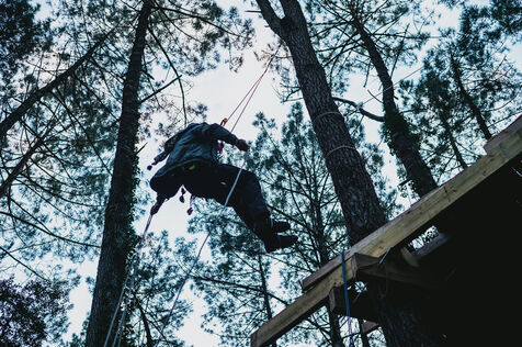 France, Soorts-Hossegor, 8 janvier 2025, Des militants ecologistes ont investi des arbres dans la foret entre Seignosse et Hossegor (Landes) pour protester contre le projet retenu par RTE (Reseau de Transport d Electricite) pour son chantier d interconnexion d une ligne Tres Haute Tension ( THT) entre la France et l Espagne. Quatre cables seront enterres sur 400km entre le nord Gironde et Bilbao. Dans les Landes, les riverains sont tres inquiets des consequences sur leur sante et l environnement. L action est ici coordonnee par le mouvement ecologiste Extinction Rebellion (XR). Photographie par Guillaume FAUVEAU / HANS LUCAS.