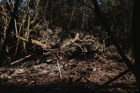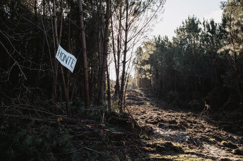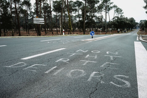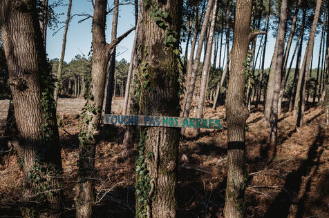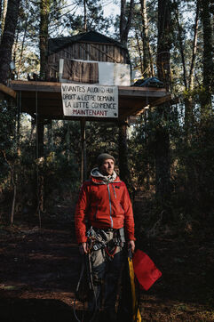 France, Soorts-Hossegor, January 14, 2025, Environmental activists took to the trees in the forest between Hossegor and Seignosse (Landes) to protest against the project selected by RTE (Reseau de Transport d Electricite) for its interconnection of a Very High Voltage (VHV) line beetween France and Spain. Four cables will be buried over 400km between northern Gironde and Bilbao. In the Landes region, local residents are very concerned about the consequences for their health and the environment.