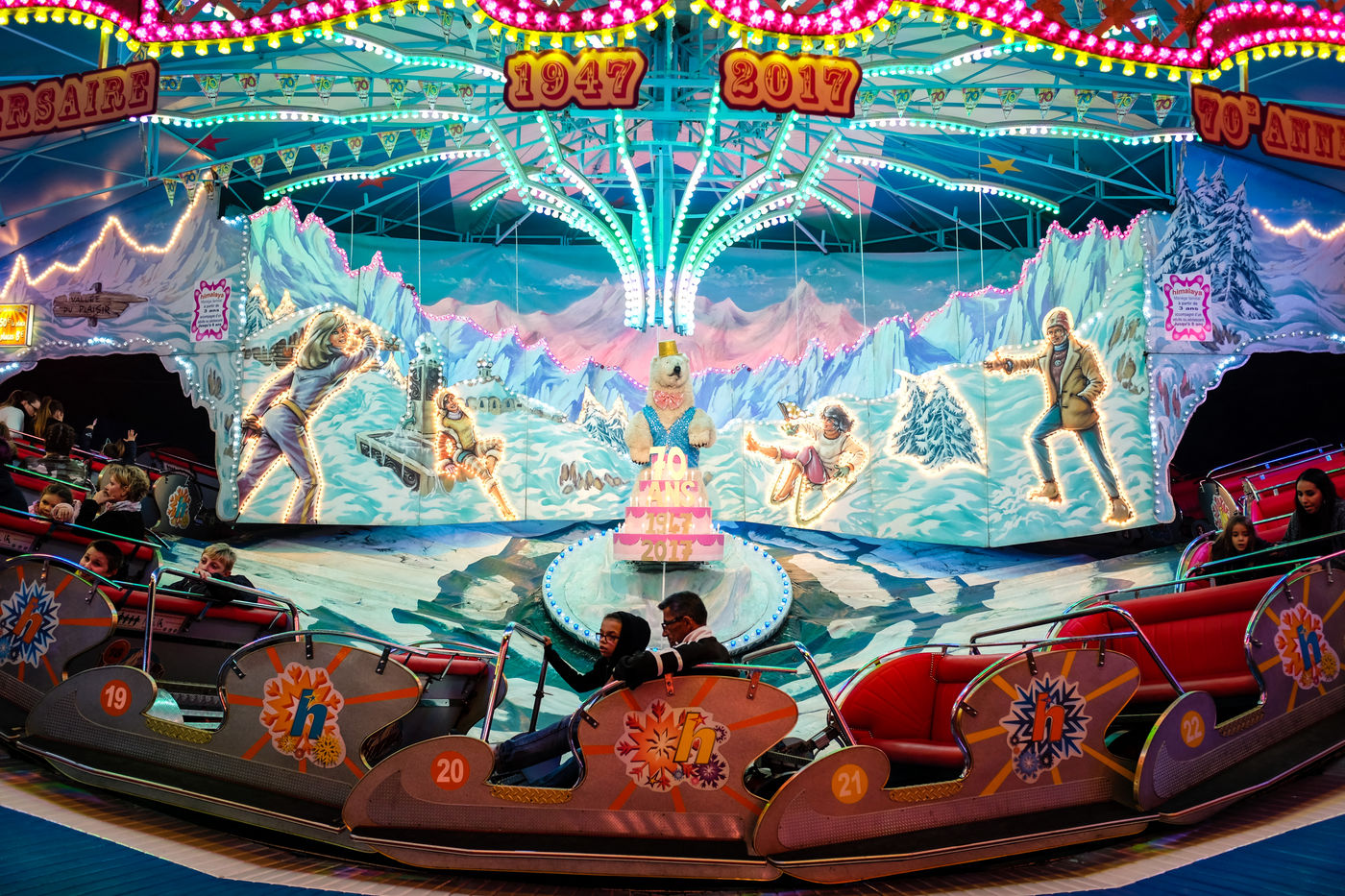 Une ambiance si particulière que la fête foraine la nuit. Les couleurs des néons, le bruit des manèges, des jeux, de la musique, les appels du pied au micro pour venir tirer une peluche ou tenter sa chance aux jeux. Puis les odeurs de confiserie qui se mêlent à celle des snacks . . .