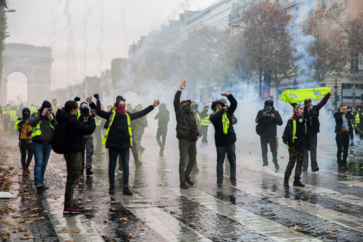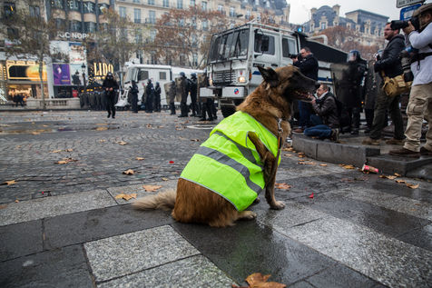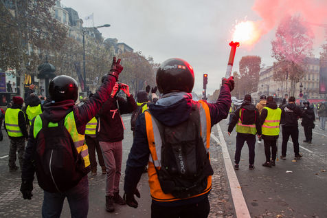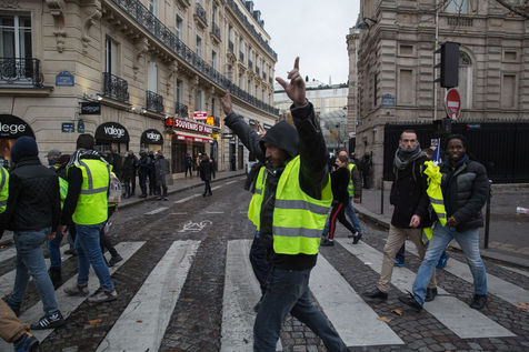 Many french people called Gilets Jaunes (Yellon Vest) demonstrate in Paris on CHamps Elysees on Saturday, 24 November 2018. Gilets Jaunes complain for a better buying power, less taxes and better way of living.