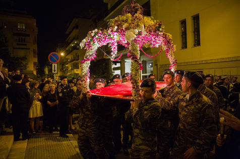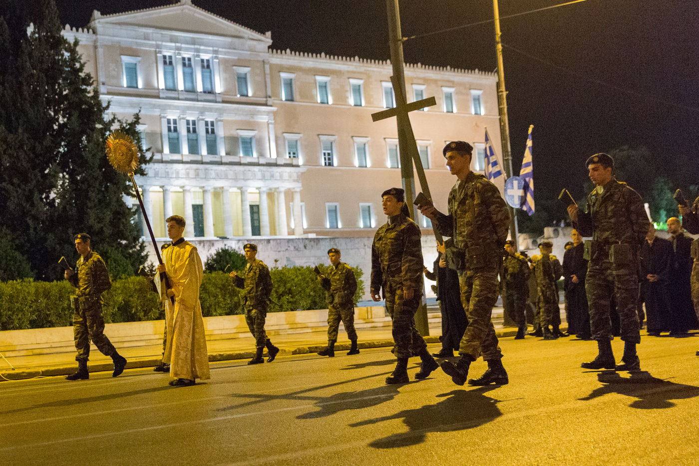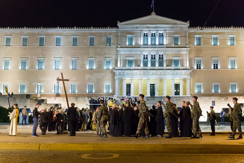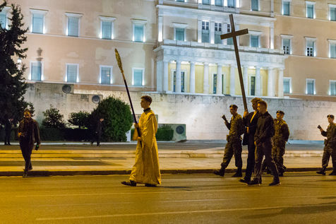 Religieux, militaires et civils participent aux celebrations de Paques Orthodoxes dans les rue d'Athenes, en Grece, pour le vendredi Saint. Toutes les eglises de la ville sont ouvertes et accueillent les croyants tout au long de la nuit. La procession principale est celle de l'Epitaphe qui represente le cercueil de Jesus Christ qui part de la Place Syntagma.