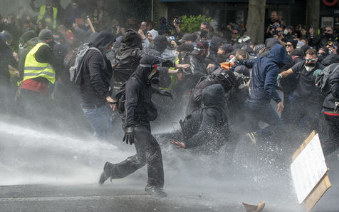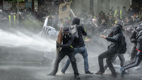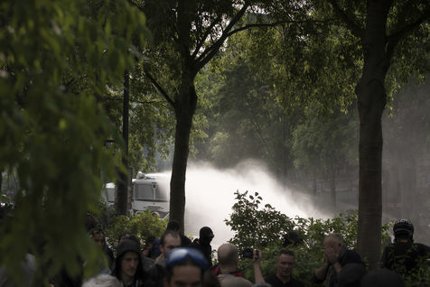 Black Blok pushed back by the police water cannon.