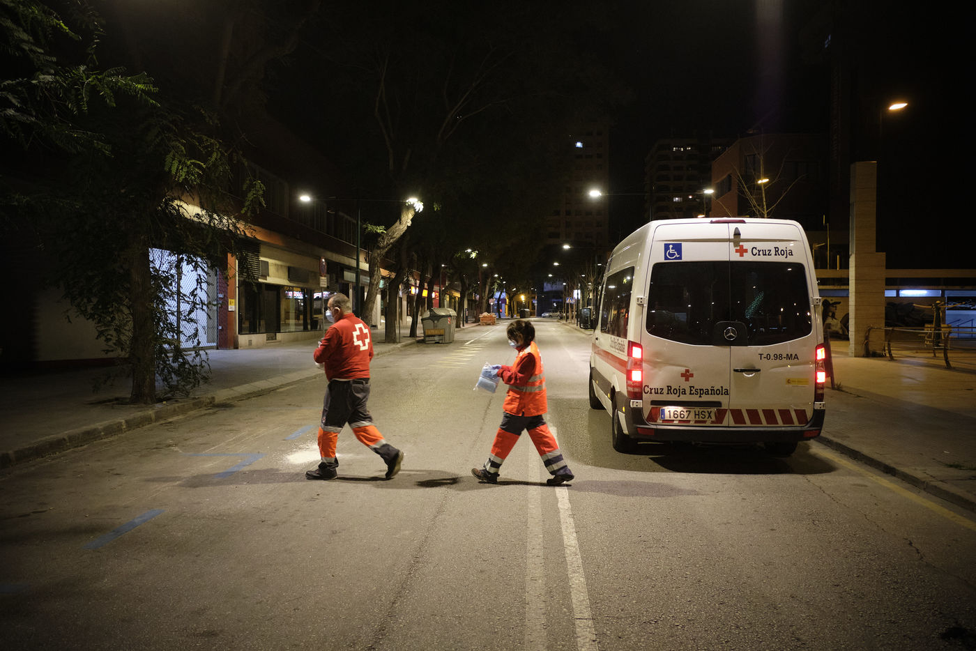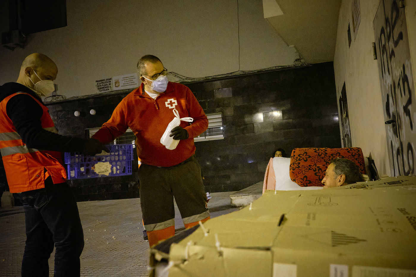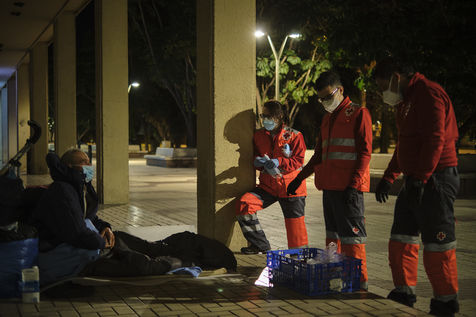 Depuis le début de la pandémie, le nombre de sans-abris dans la ville de Malaga a considérablement augmenté. Avec l'aide de bénévoles, la Croix Rouge organise quotidiennement des maraudes nocturnes sillonnant les rues à la recherche de personnes qui passeront la nuit dehors dans le froid. Durant leurs tournées, les volontaires distribuent de la nourriture, des vêtements chauds, des couvertures, des produits hygiéniques, des masques.