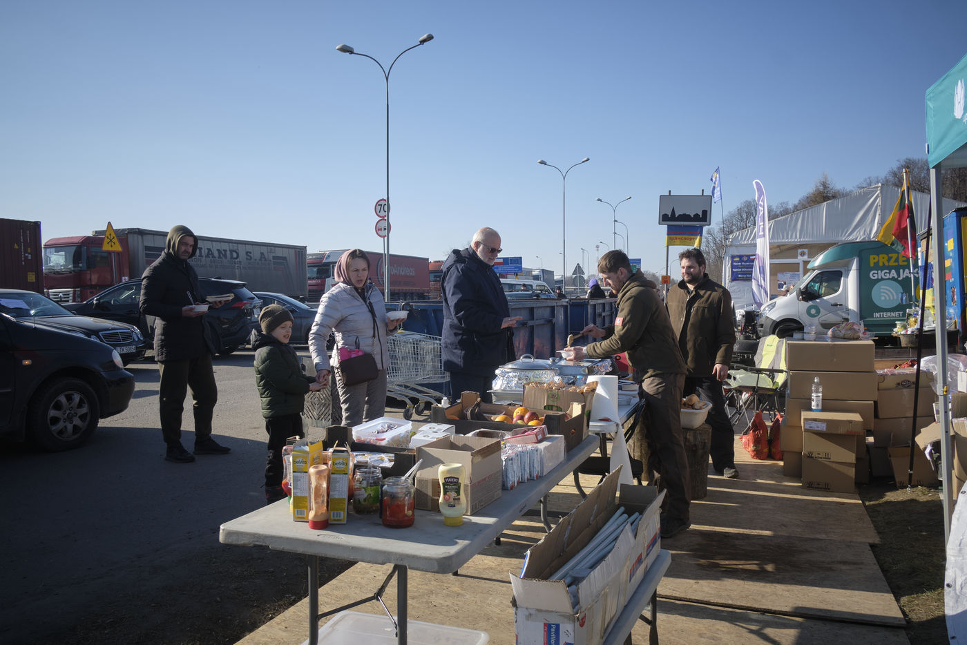 Depuis le début de l'invasion de l'Ukraine par les forces Russes, des milliers de réfugiés Ukrainiens, principalement des femmes accompagnées de leurs enfants et des grands-parents, fuient leur pays pour trouver une aide internationale une fois la frontière traversée. L'armée et la police polonaise mais aussi de nombreuses associations accueillent les familles en leur proposant de la nourriture, des vêtements chauds, une SIM carte, des boissons, des produits de première nécessité, un lieu pour se reposer, se réchauffer, retrouver un semblant d'espoir.