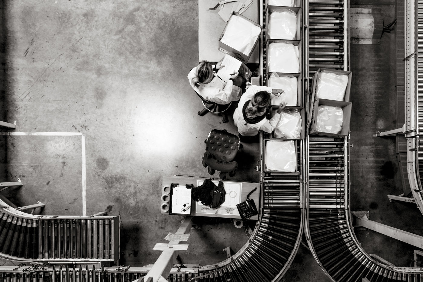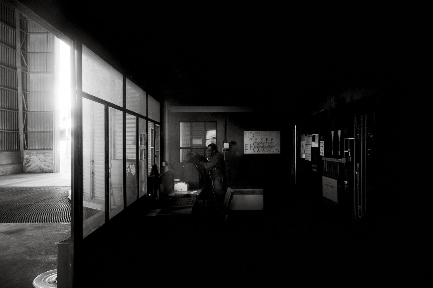 Voici une petite sélection sur les quarante photographies en noir et blanc qui composent la série, volontairement contrastées, à la composition géométrique, parfois minimaliste, parfois exagérément surchargée, cherchent à mettre en relief l'environnement de ces femmes et de ces hommes à leur poste de travail, en jouant sur la disproportion de l'un par rapport à l'autre, sur le côté convivial de ces lieux ou au contraire sur leur côté hostile. Ces photos ont été faites en octobre 2016 en région toulousaine, dans le sud-ouest de la France.