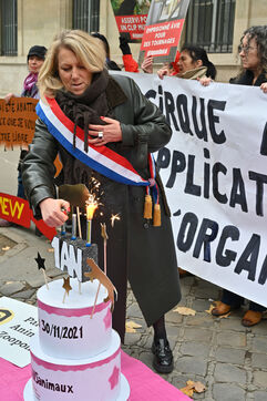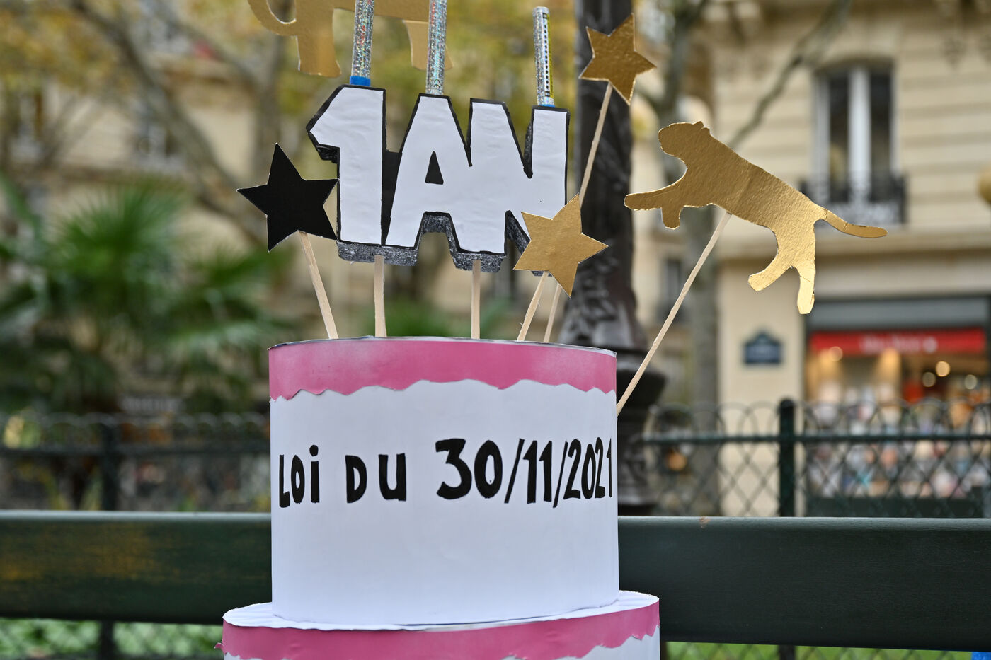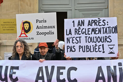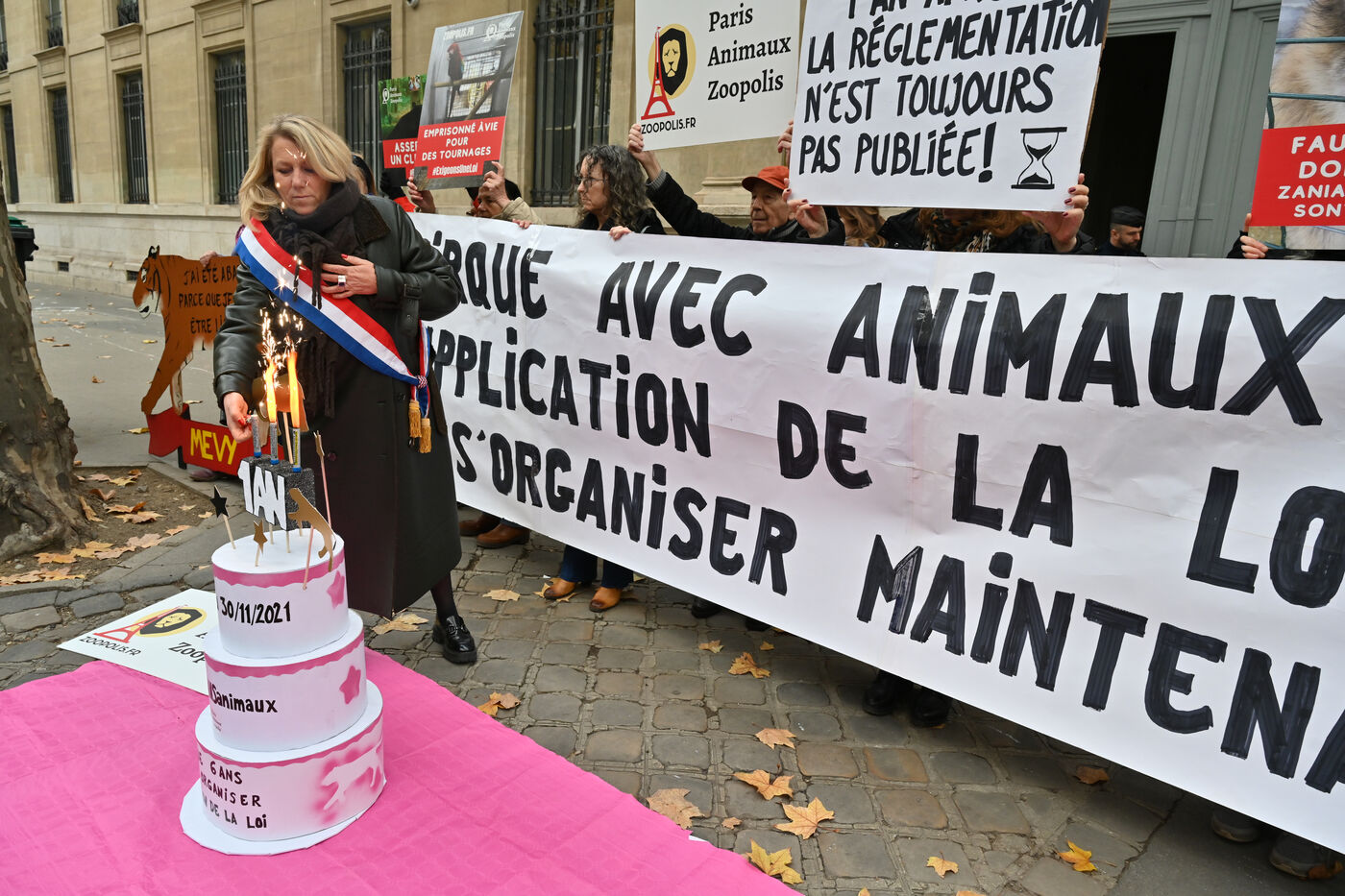 PAZ activists demonstrate for the anniversary of the law of 30/11/2021 concerning the ban on wild animals in travelling circuses in front of the Ministry of Ecology.
