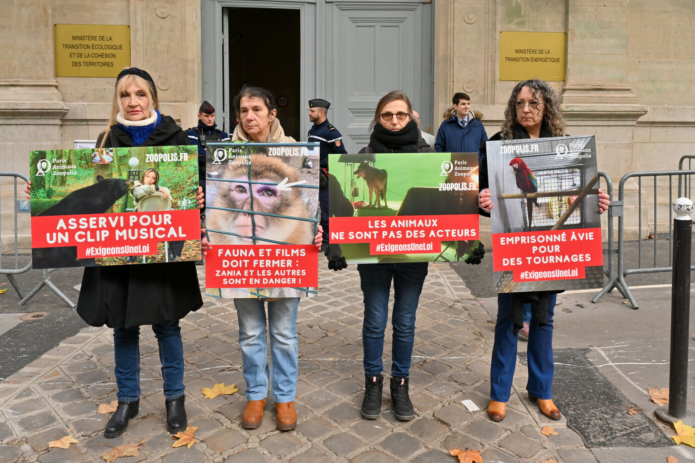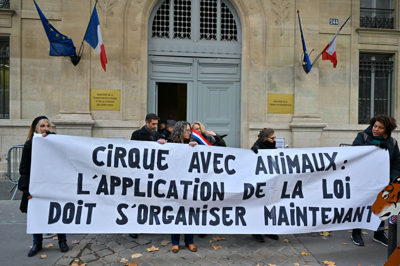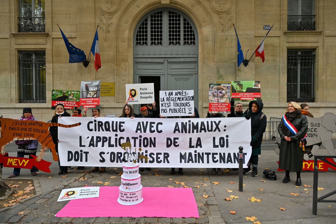 Des militant-es PAZ, manifestent pour l anniversaire de la loi du 30/11/2021 concernant l interdiction des animaux sauvages dans les cirques itinérants devant le ministère de l écologie.